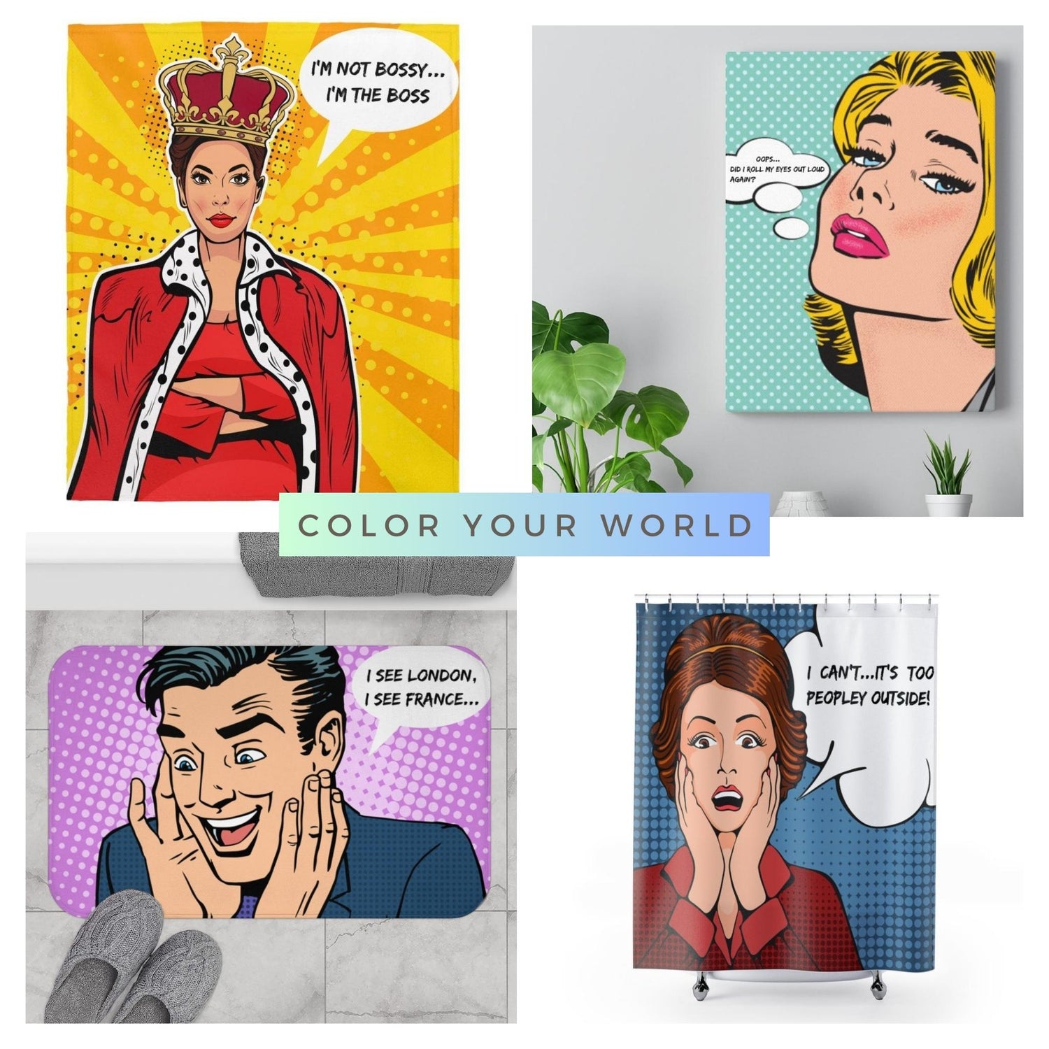 Colors so vibrant, these designs really POP! In the style of vintage comic books, but with a distinctly modern update, this collection will shine a spotlight on your incredible sense of humor and style!