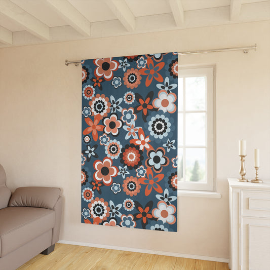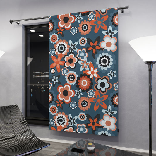 Retro 60s 70s Groovy Flowers Boho Mid Century Mod Coral & Blue Blackout Window Curtain