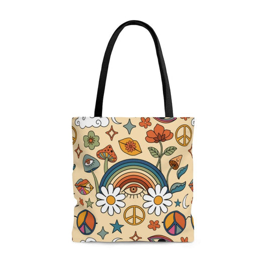 Retro Trippy Mushroom, Eye & Rainbow Hippie Tote Bag