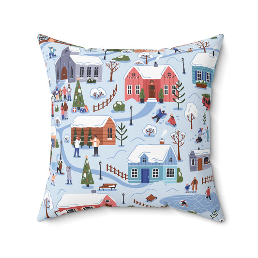 Small Town Christmas Village, Retro Vintage Winter Scene, Multicolor Holiday Throw Pillow