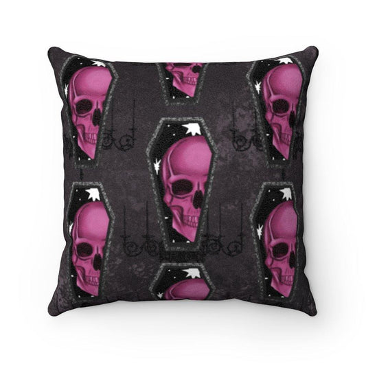 Spooky Skull and Coffin Halloween Pillow Pink & Black Glam Goth Decor