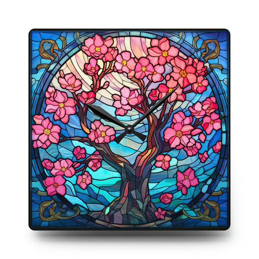 Cherry Blossom Tree Stained Glass Inspired, Sakura Pink & Blue Acrylic Wall Clock