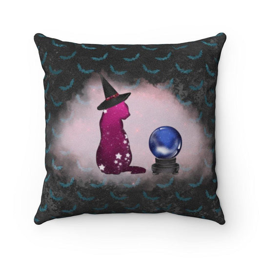 Cosmic Witch Cat & Crystal Ball in Mist Halloween Pillow Goth Glam