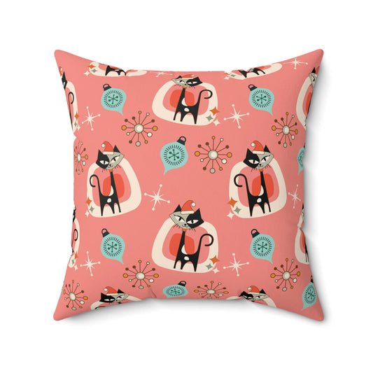 Retro 1950s Christmas Atomic Cats Mid Century Mod Pink Coral Throw Pillow