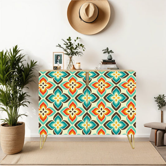Retro 50's 60's Flowers Mid Century Mod Vintage Inspired Orange & Blue Sideboard, Credenza, Wooden Storage Cabinet