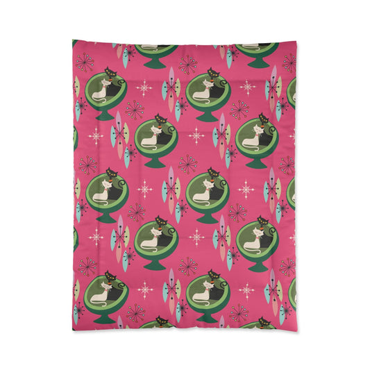 Retro 50s Atomic Cat Couple in Ball Chair Mid Century Mod Pink & Green Comforter