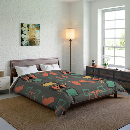 Retro 50s Atomic Cat & Starburst Mid Century Gray, Coral & Green Comforter