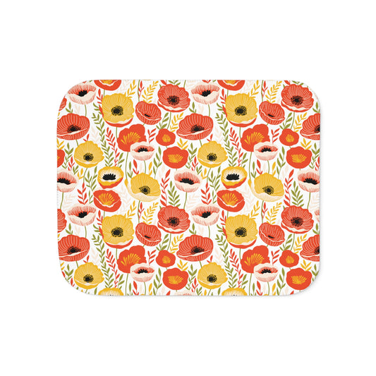 Retro 60's Mid Century Mod Poppies Floral Cottagecore Yellow, Orange & Green Sherpa Blanket