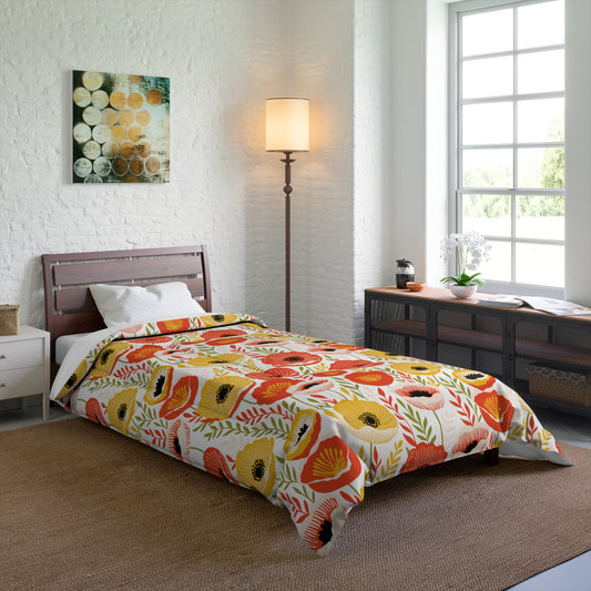 Retro 60's Mid Century Mod Poppies Floral Cottagecore Yellow, Orange & Green Comforter