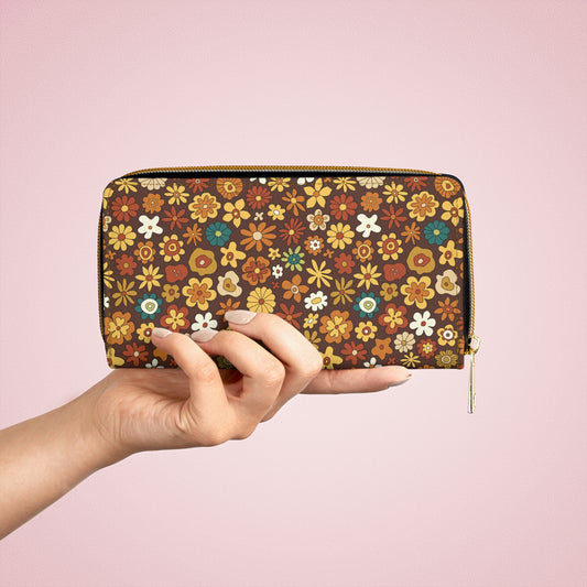 Retro 60s 70s Groovy Floral Mid Century Modern Boho Brown Zipper Wallet