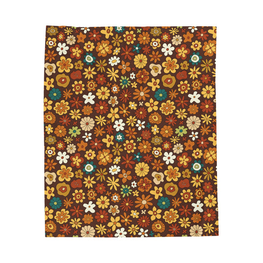 Retro 60s 70s Groovy Floral MCM Boho Brown Lightweight Velveteen Blanket
