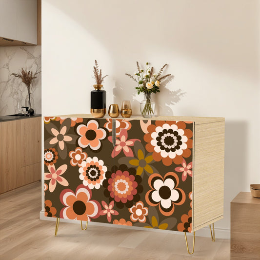 Retro 60s 70s Groovy Brown Flowers Boho Mid Century Modern Credenza, Sideboard, Wooden Storage Cabinet