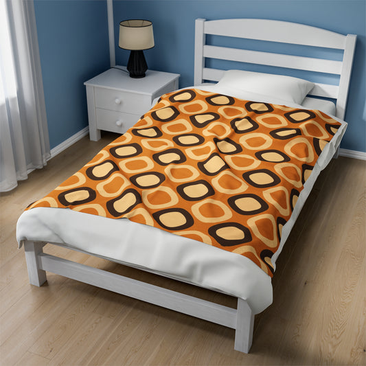Retro 60s 70s Mod Squares MCM Orange, Brown Lightweight Velveteen Blanket