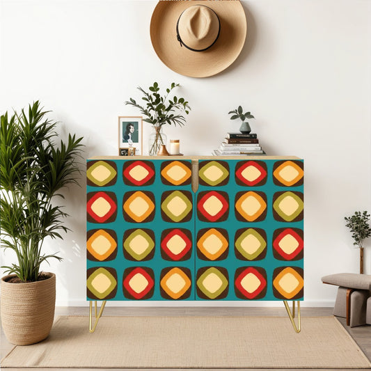 Retro 60s, 70s Mod Squares Multicolor Mid Century Modern Sideboard, Credenza, Wooden Storage Cabinet