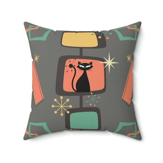 Retro Atomic Cat, 50s Starburst Mid Century Mod Coral & Gray Throw Pillow