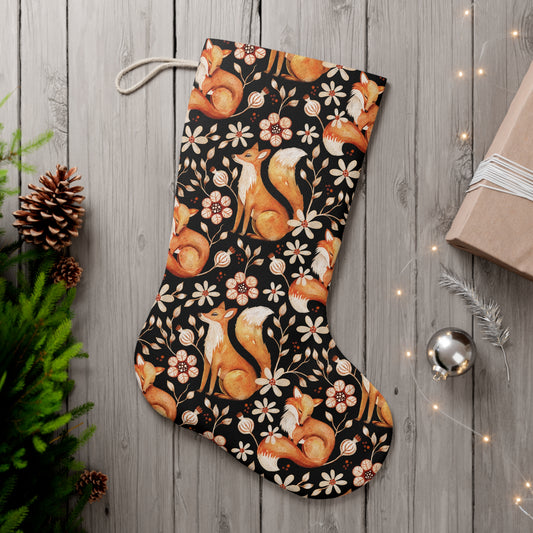 Enchanted Woodland Fox, Floral Dark Cottagecore Watercolor Style, Black Yule Christmas Stocking