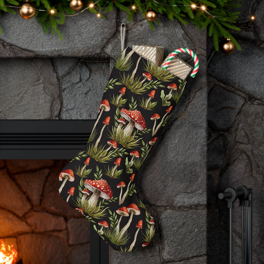 Amanita Mushroom Enchanted Forest Christmas, Witchy Cottagecore Black Stocking