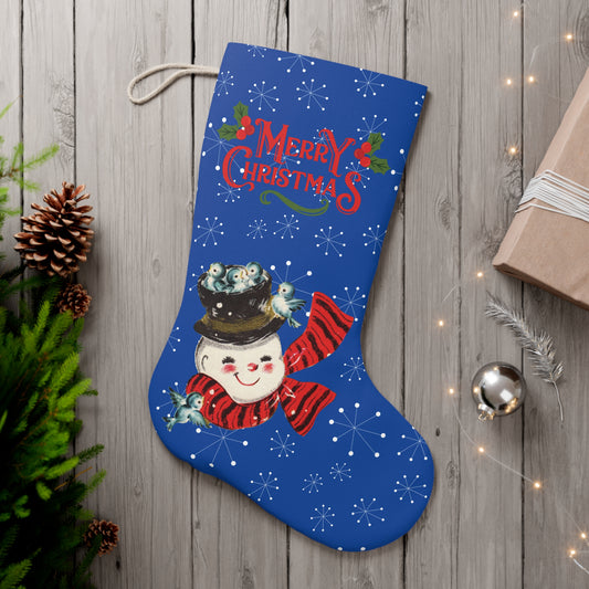 Retro 50s Vintage Snowman with Blue Birds, Atomic Starburst Mid Century Bold Blue Christmas Stocking