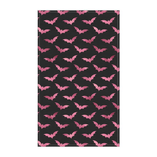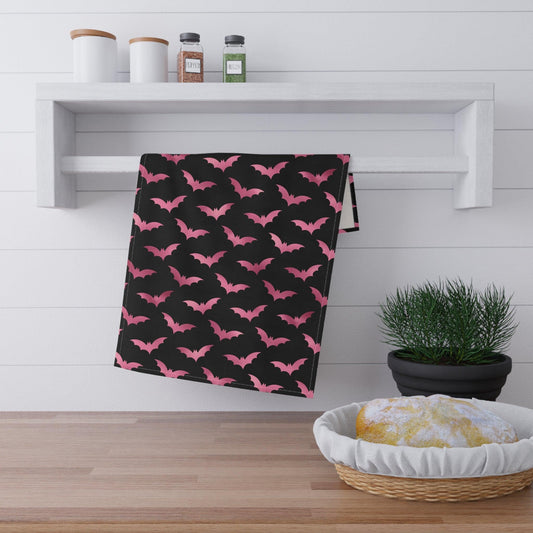 Pink Bats Spooky Halloween Glam Goth Black Kitchen Tea Towel