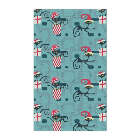 Retro Atomic Cats MCM Blue Christmas Tea Towel