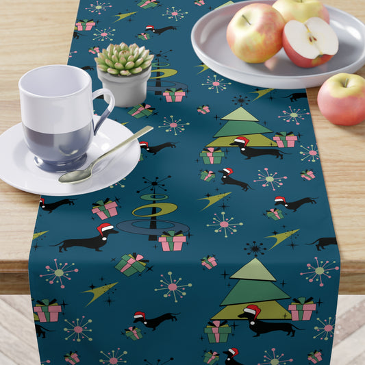 Retro 50's Atomic Dachshund Wiener Dog Mid Century Mod Blue Christmas Table Runner
