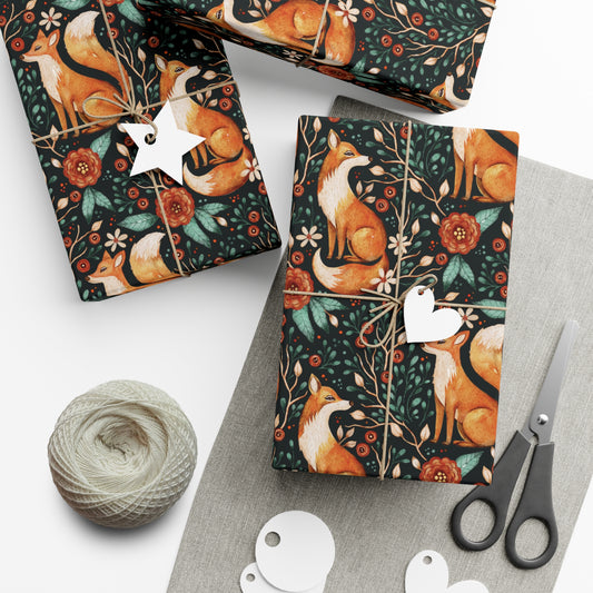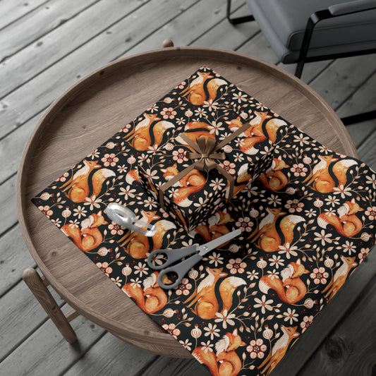 Enchanted Woodland Fox, Floral Dark Cottagecore Watercolor Style, Black Eco-Friendly Gift Wrap