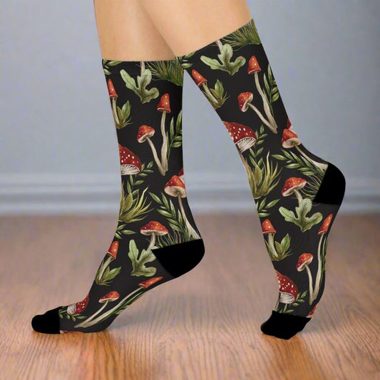 Amanita Muscaria Mushroom, Dark Cottagecore Watercolor Black, Red & Green Cushioned Crew Socks