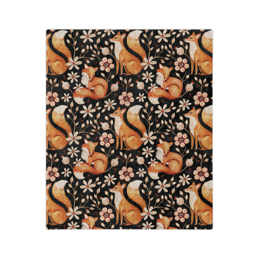 Enchanted Woodland Fox, Floral Dark Cottagecore Watercolor Style, Black Velveteen Microfiber Blanket