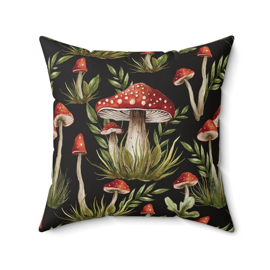 Amanita Muscaria Mushroom, Dark Cottagecore Watercolor Black, Red & Green Throw Pillow