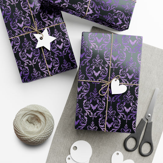 Purple Damask Bats, Victorian Goth Inspired, Dark Academia Goth Christmas & Creepmas Glam Goth Black Gift Wrap Paper