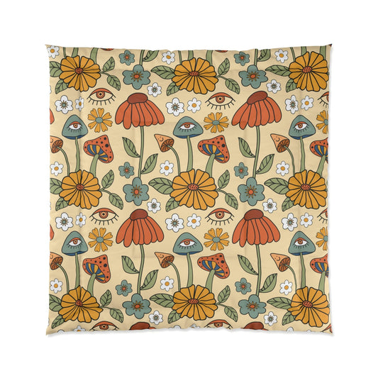 Boho Trippy Mushroom & Flowers Hippie Cottagecore MCM Comforter