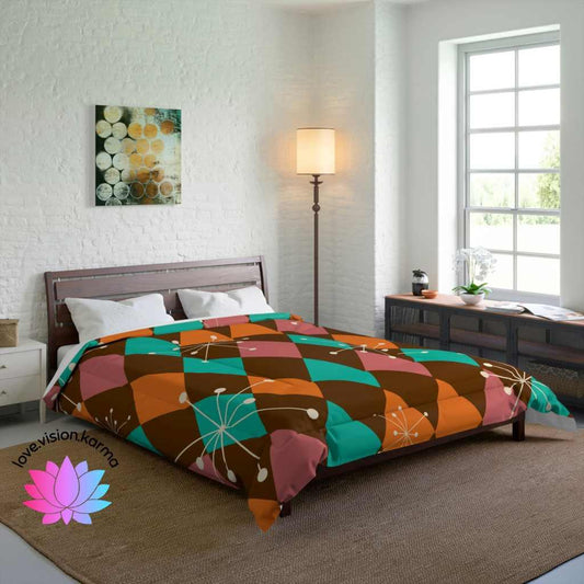 Retro Atomic Starburst Diamonds Mid Century Pink, Orange, Brown Comforter