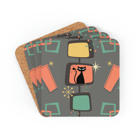 Retro Atomic Cat Mid Century Burst Gray, Coral & Green Coaster Set