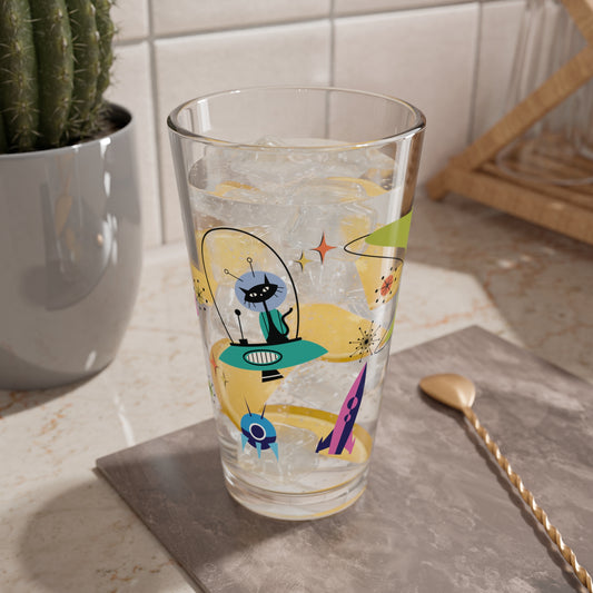 Retro 50s Space Age Atomic Black Cat, Boomerang & Spaceship MCM Multicolor Pint Glass