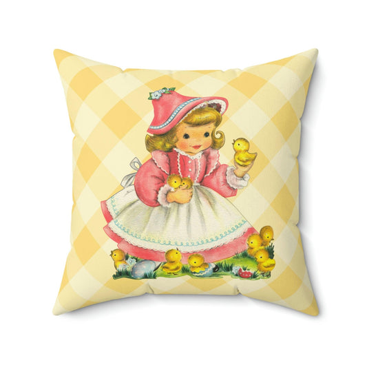 Retro Easter Vintage Girl with Chicks MCM Yellow Pillow