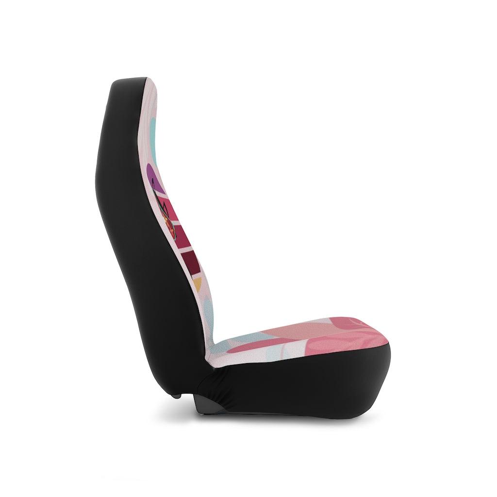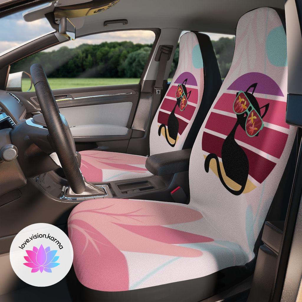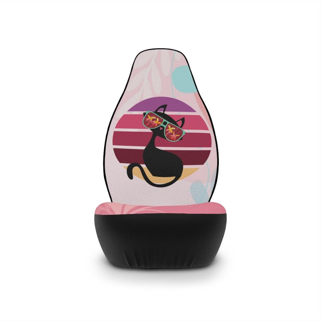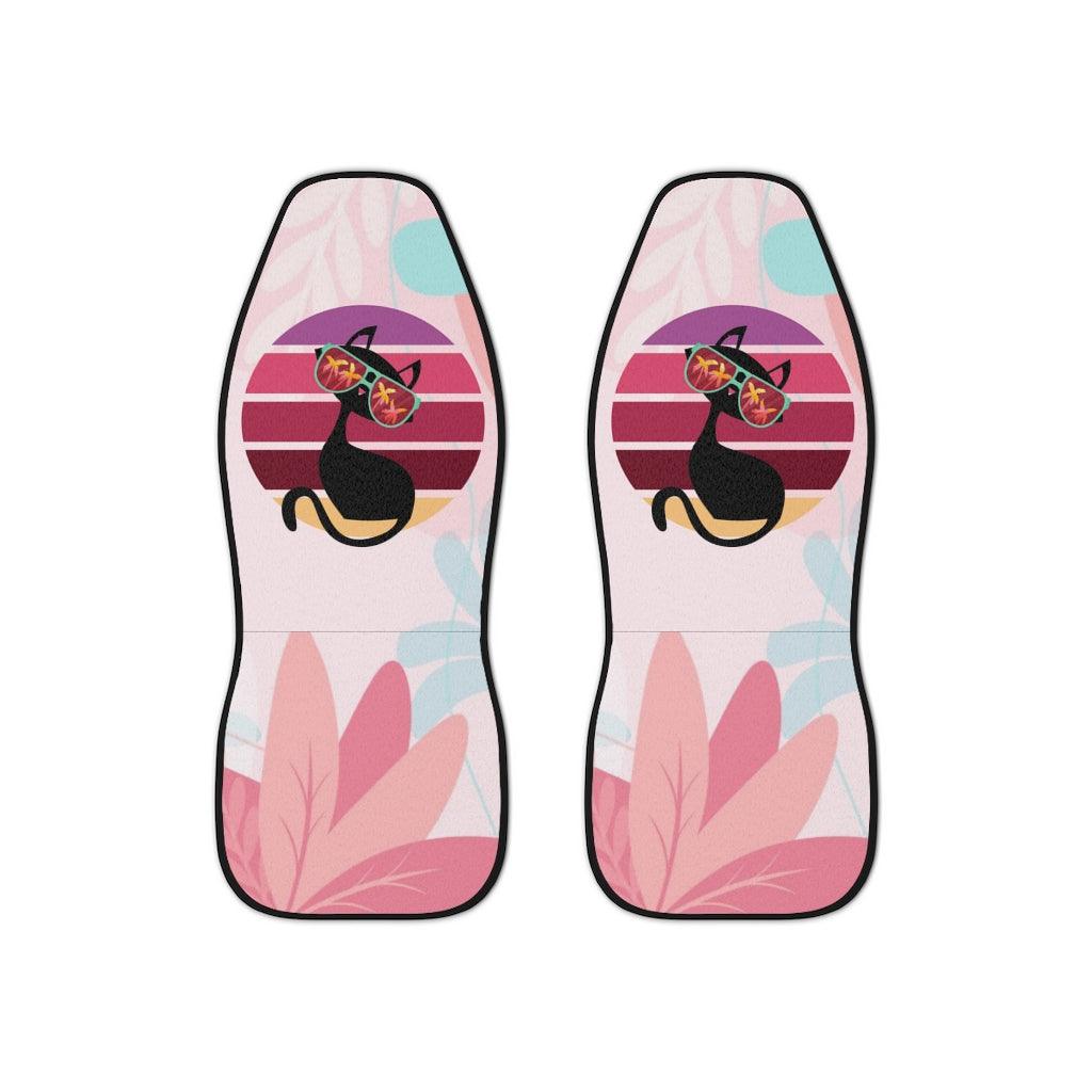Customize your car's interior with these sweet retro style, tropical sunset pink, atomic cat car seat covers! Made of thick, high quality polyester fabric for durability that lasts. Sold as a set of TWO. Important to note that these covers should NOT be used on seats with side airbags or armrests.