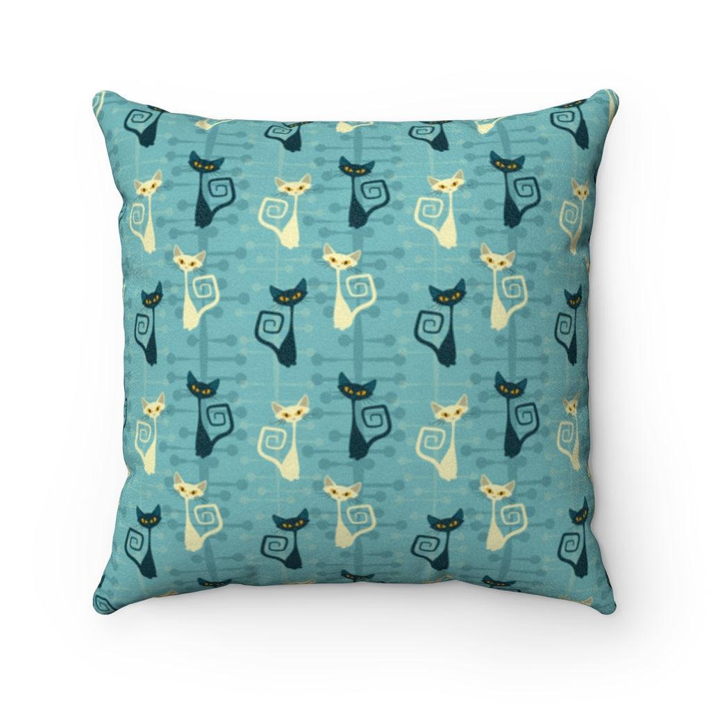 Stylish atomic kitties lend their chic vibes to this 1950s mid century inspired throw pillow. Have fun accenting your bed, sofa or reading chair with this retro style pillow!