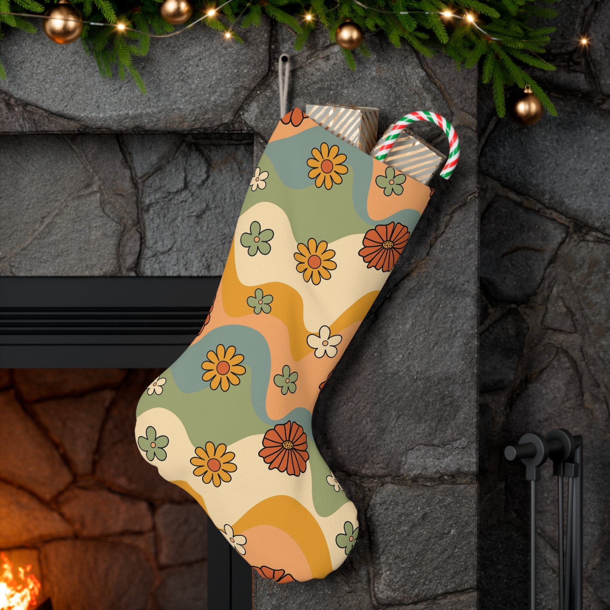 Our groovy flowers and waves boho Christmas stocking is generously sized for all your stocking stuffers! The double sided mid century boho print ensures it looks good from any angle while it hangs on your mantel, plus it adds some groovy boho vibes to your home too!