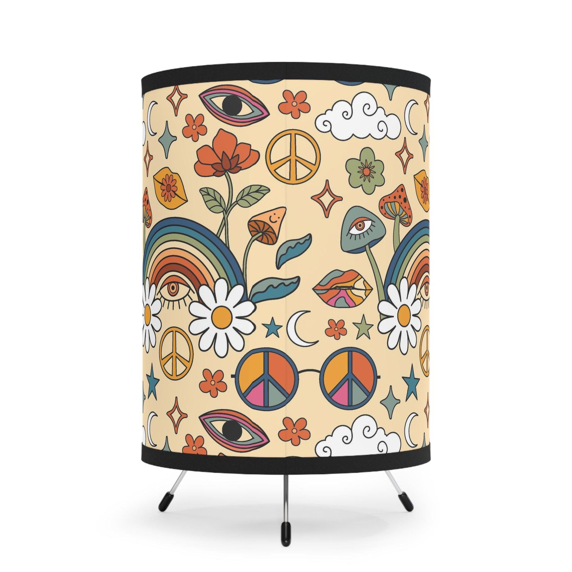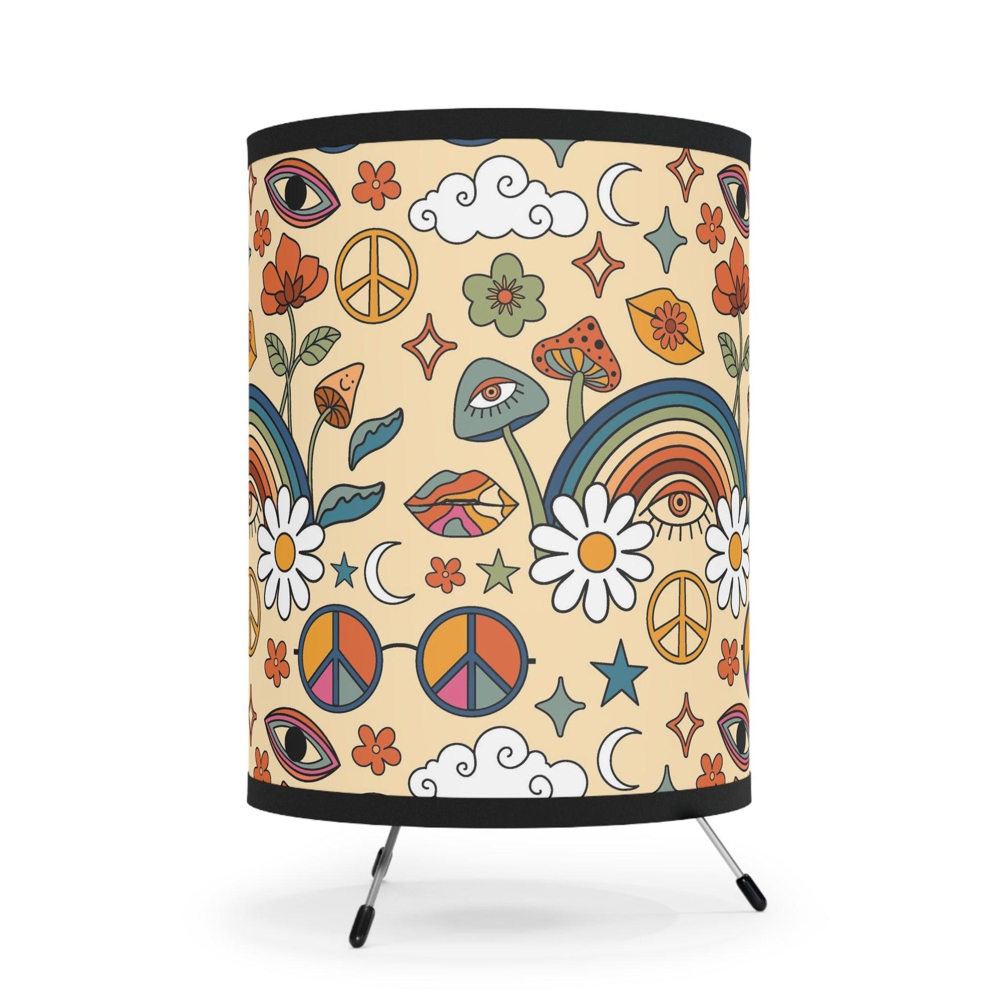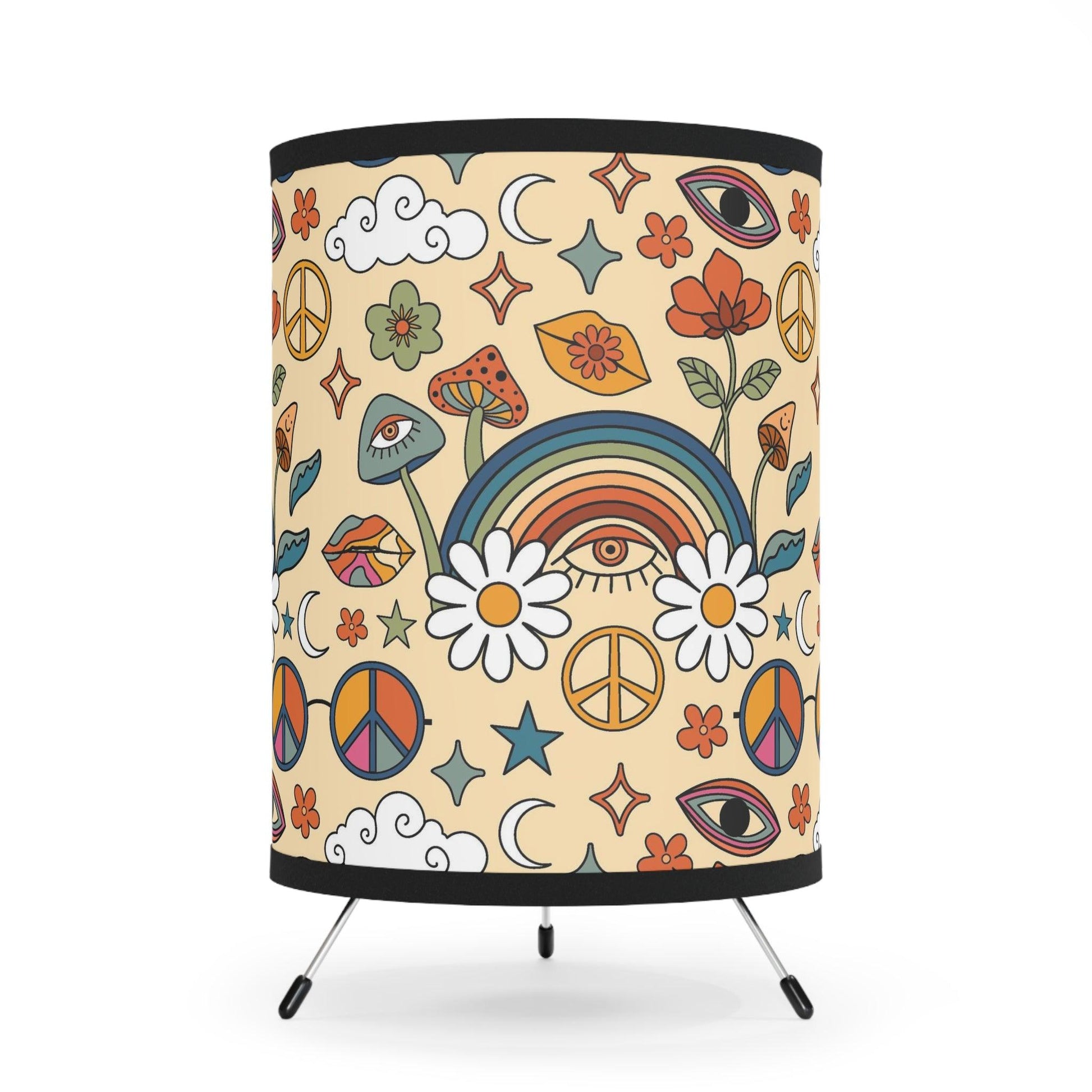 Our tabletop tripod lamp featuring trippy mushrooms, groovy rainbows and flowers in bold colors is the perfect choice for anyone looking to add a touch of cosmic energy to their home. Whether you're a fan of psychedelic art or just looking for something that hits a little different, this lamp is for you. Overhead lighting is over used....so switch on your tabletop lamp and add some retro vibes to your pad!