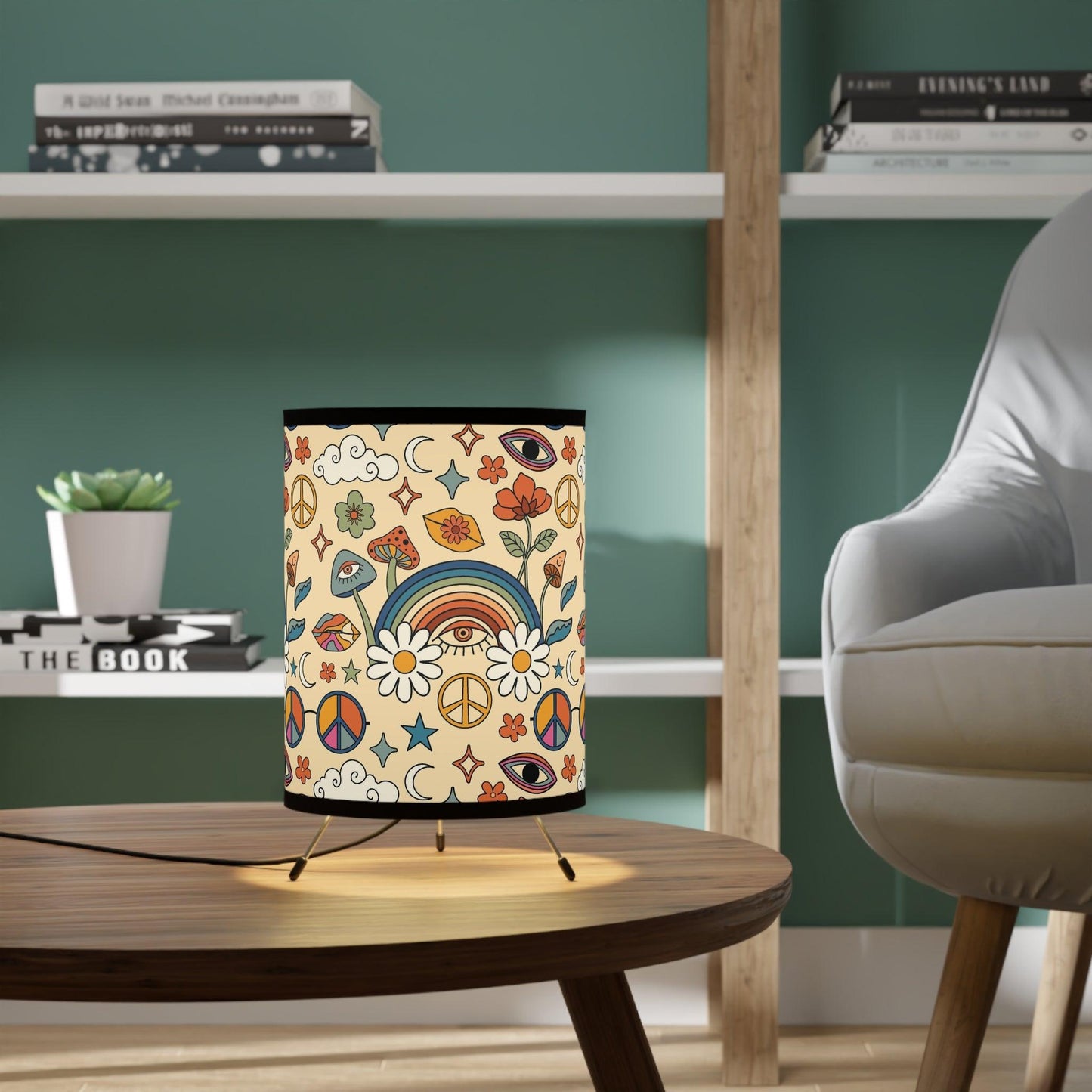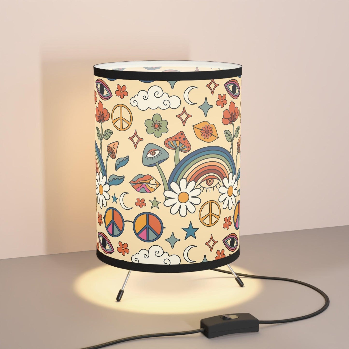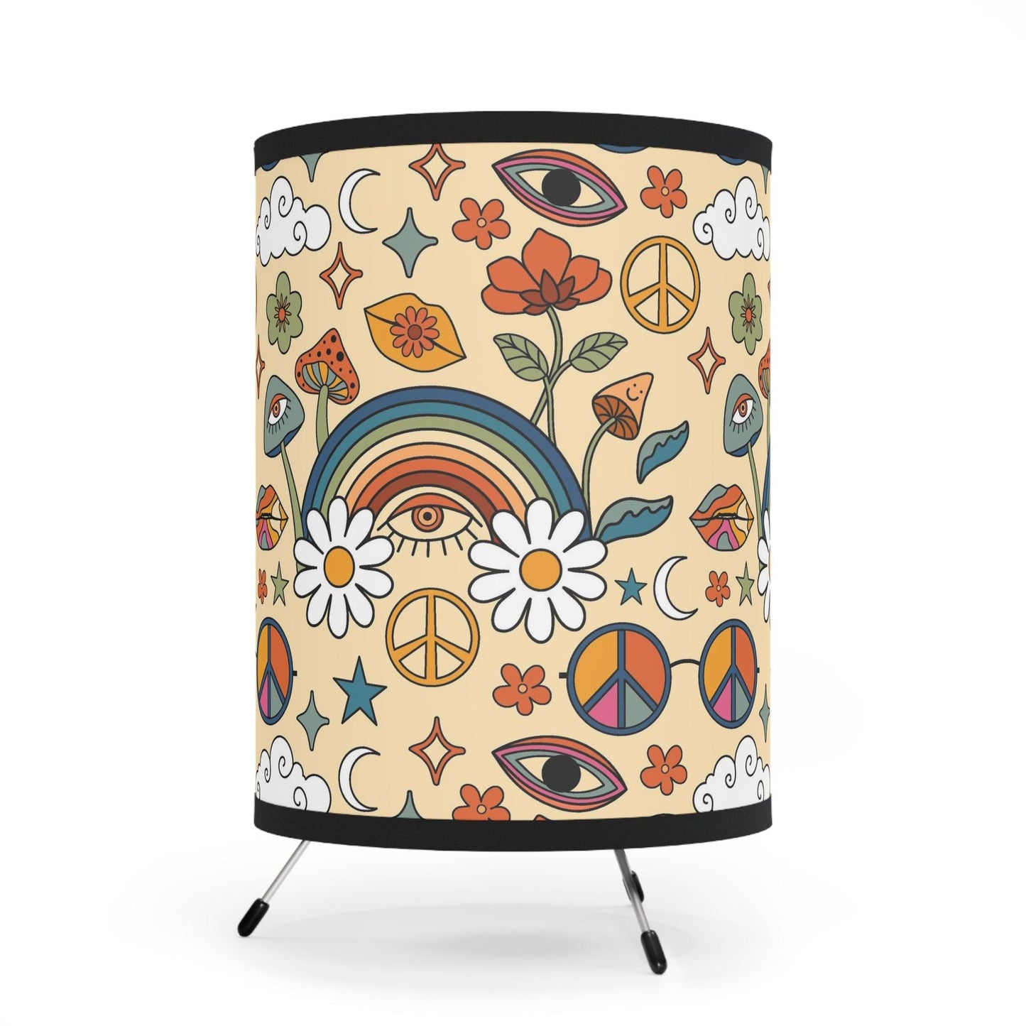 Our tabletop tripod lamp featuring trippy mushrooms, groovy rainbows and flowers in bold colors is the perfect choice for anyone looking to add a touch of cosmic energy to their home. Whether you're a fan of psychedelic art or just looking for something that hits a little different, this lamp is for you. Overhead lighting is over used....so switch on your tabletop lamp and add some retro vibes to your pad!