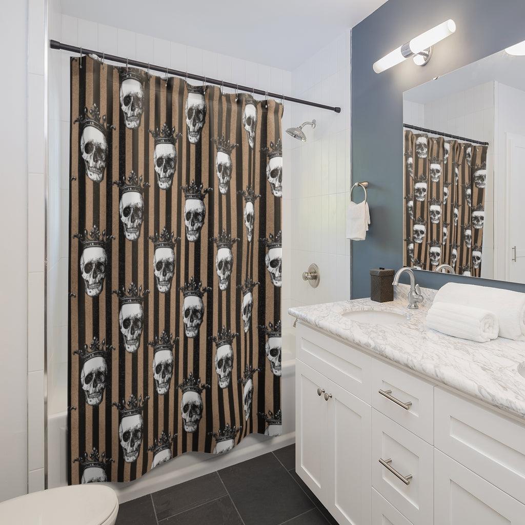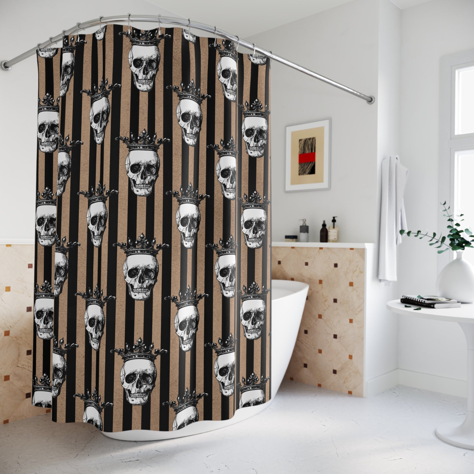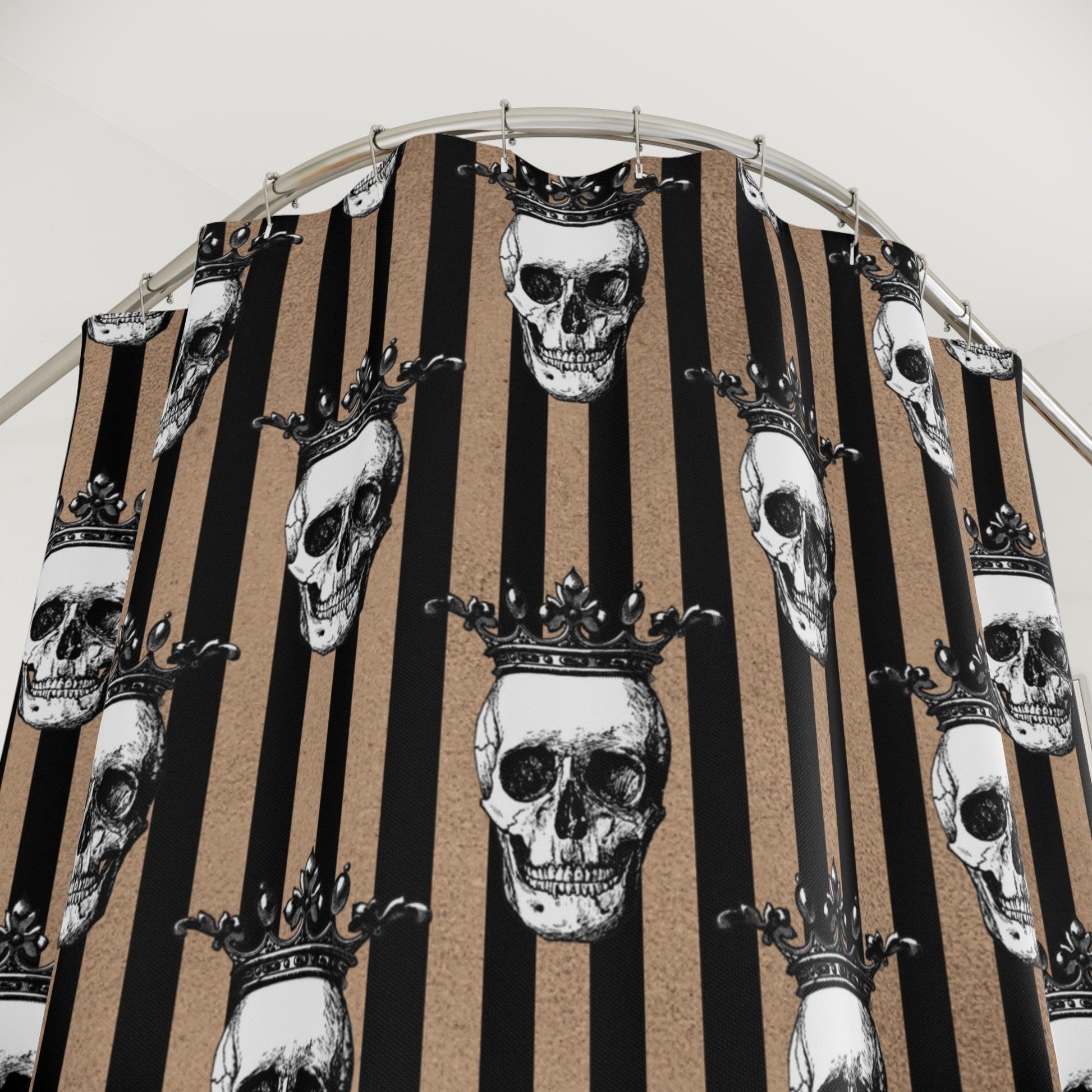 Our glam goth shower curtain features skulls that be looking like royalty here, with their regal crowns! Behind these crowned skulls is a tan and black stripe pattern to add some chic dark vibes to your bathroom for those who like a more sinister aesthetic and also for those looking to switch up their decor for a fun Halloween makeover!