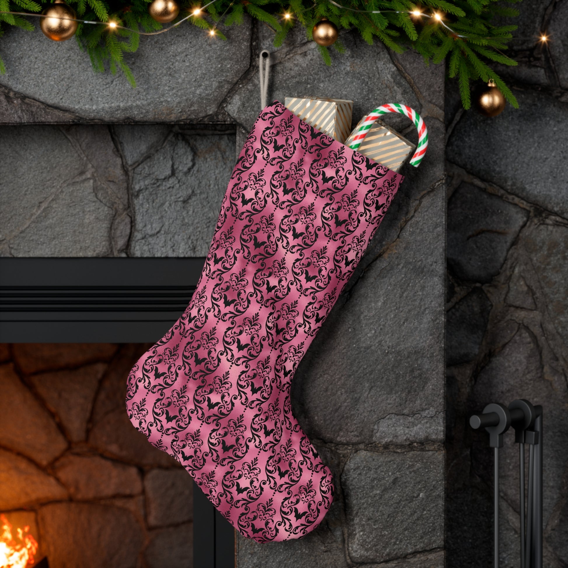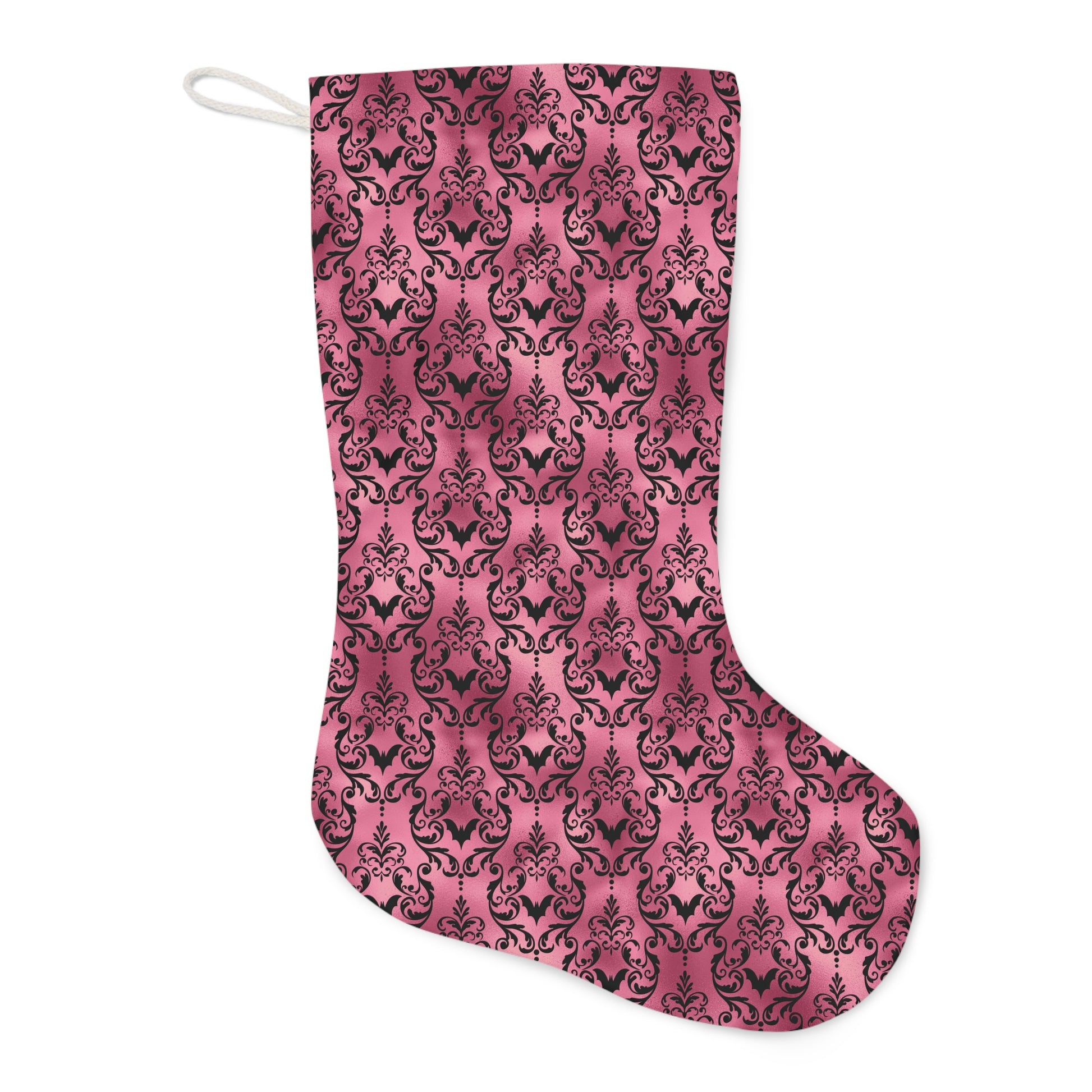 Perfect for your Goth Christmas, our pink, Victorian goth inspired damask bats stocking allows you to invite a touch of intrigue to your festive holiday celebrations. Generously sized for all your stocking stuffers, plus it adds some glam goth style as it hangs from your mantel. Whether you call it Creepmas or Gothmas, our glam pink damask bats stocking ensures you don't have to veer far from your dark aesthetic while you have yourself a very creepy Christmas!