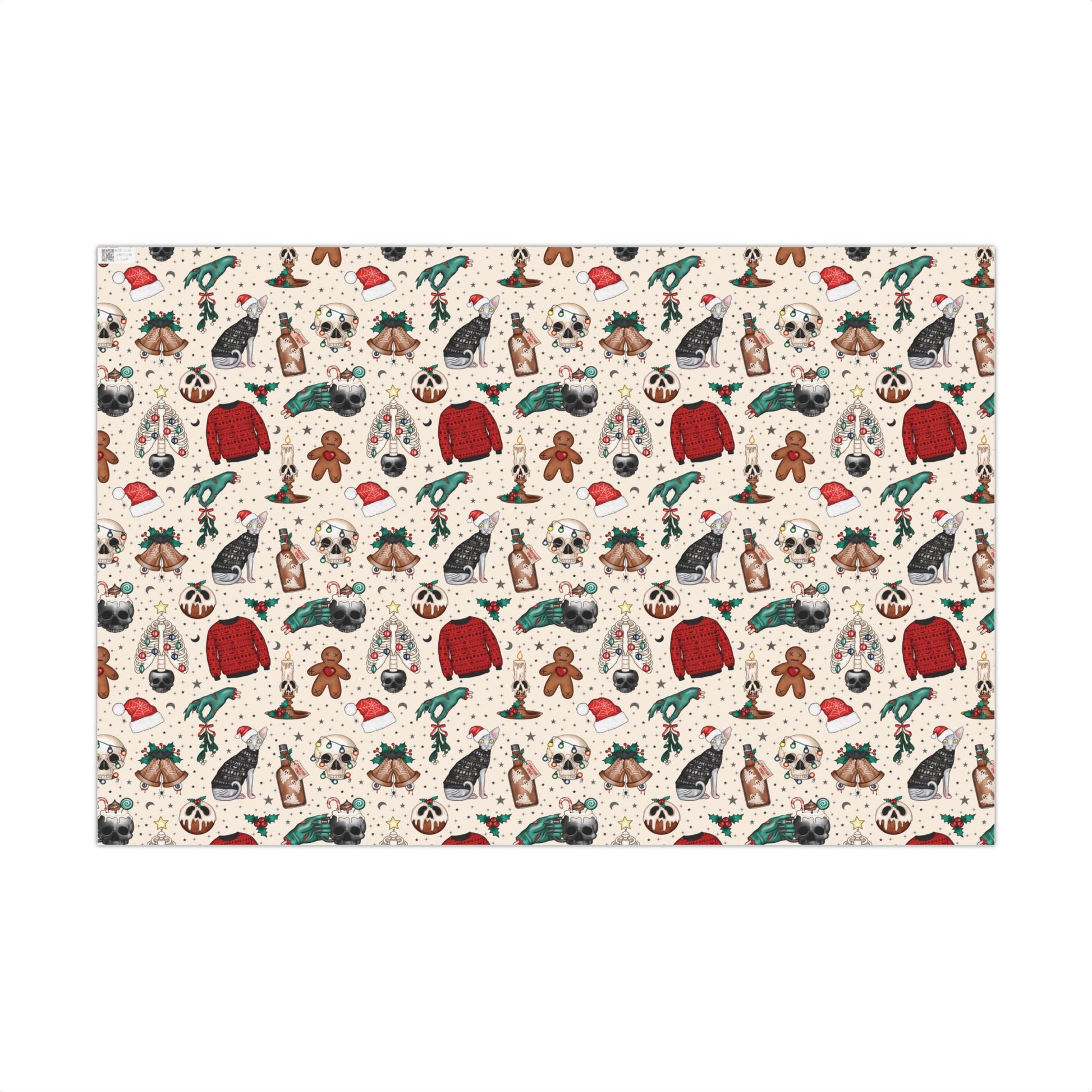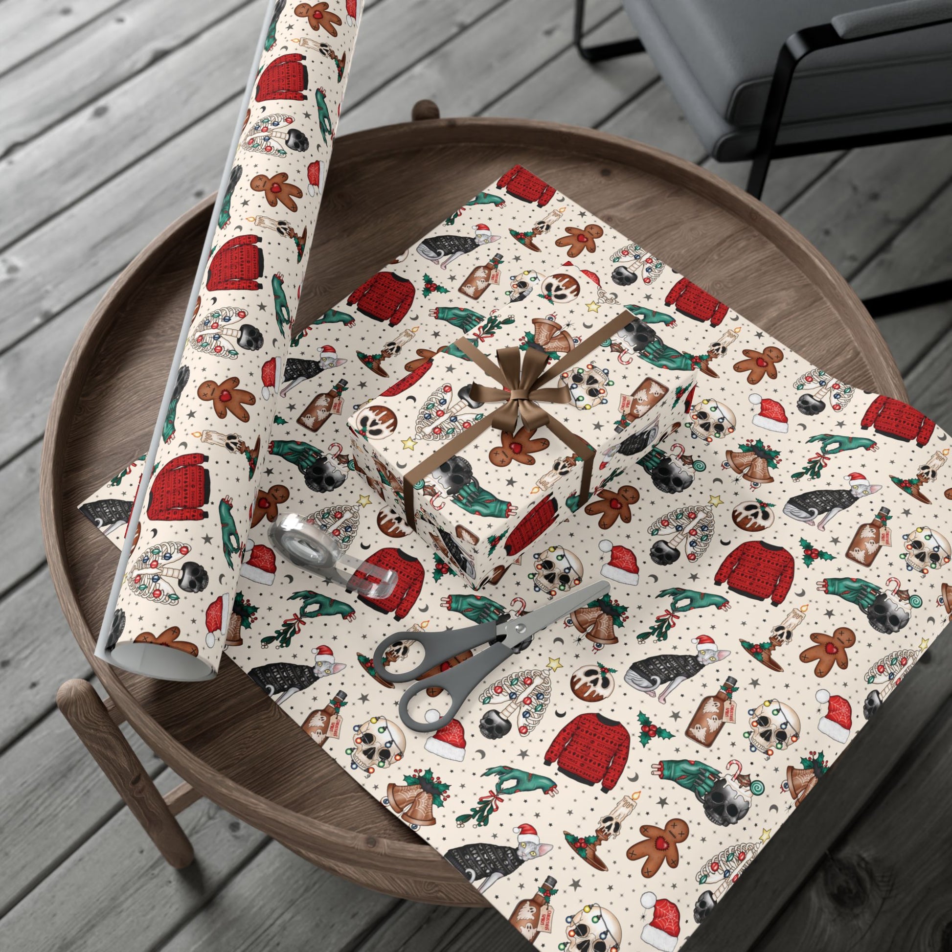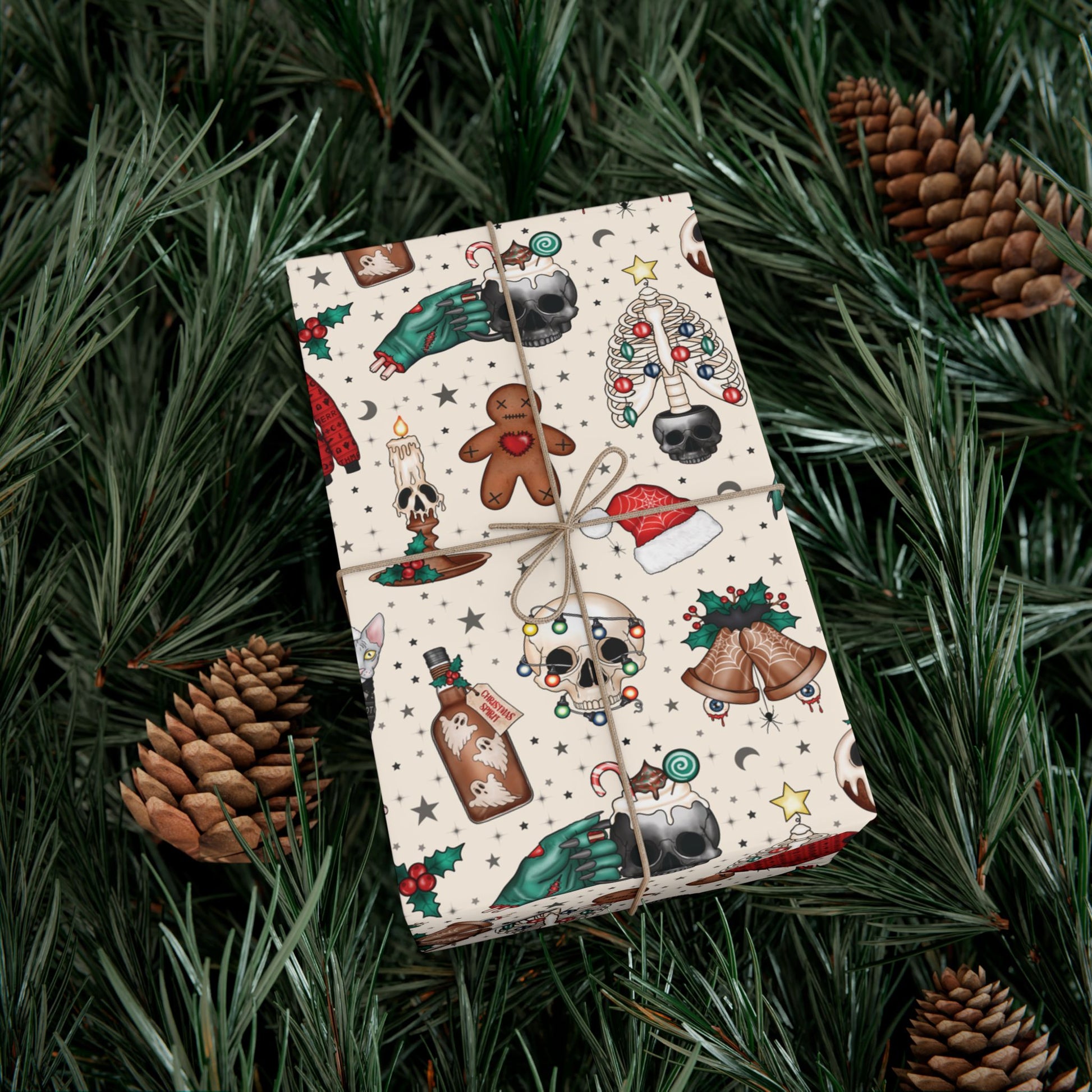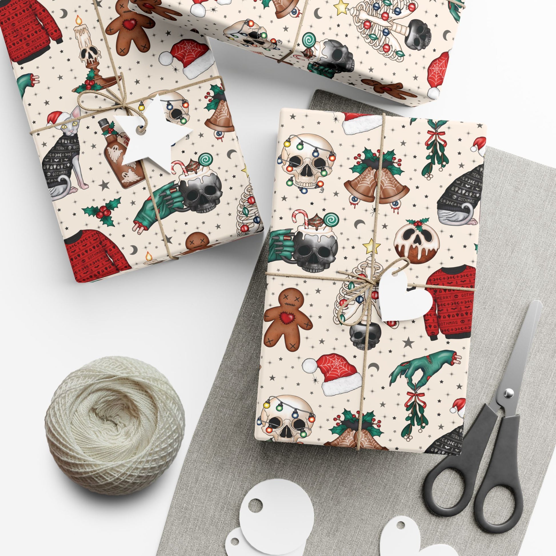 Our goth Christmas or Creepmas holiday gift wrap transforms the act of gift-giving into a whimsical and opulent spectacle, with its cute, yet macabre design! Whether you're celebrating the holidays, a special occasion, or simply reveling in the art of presenting gifts, this extraordinary wrapping paper adds a touch of grandeur and kitsch to your festivities.