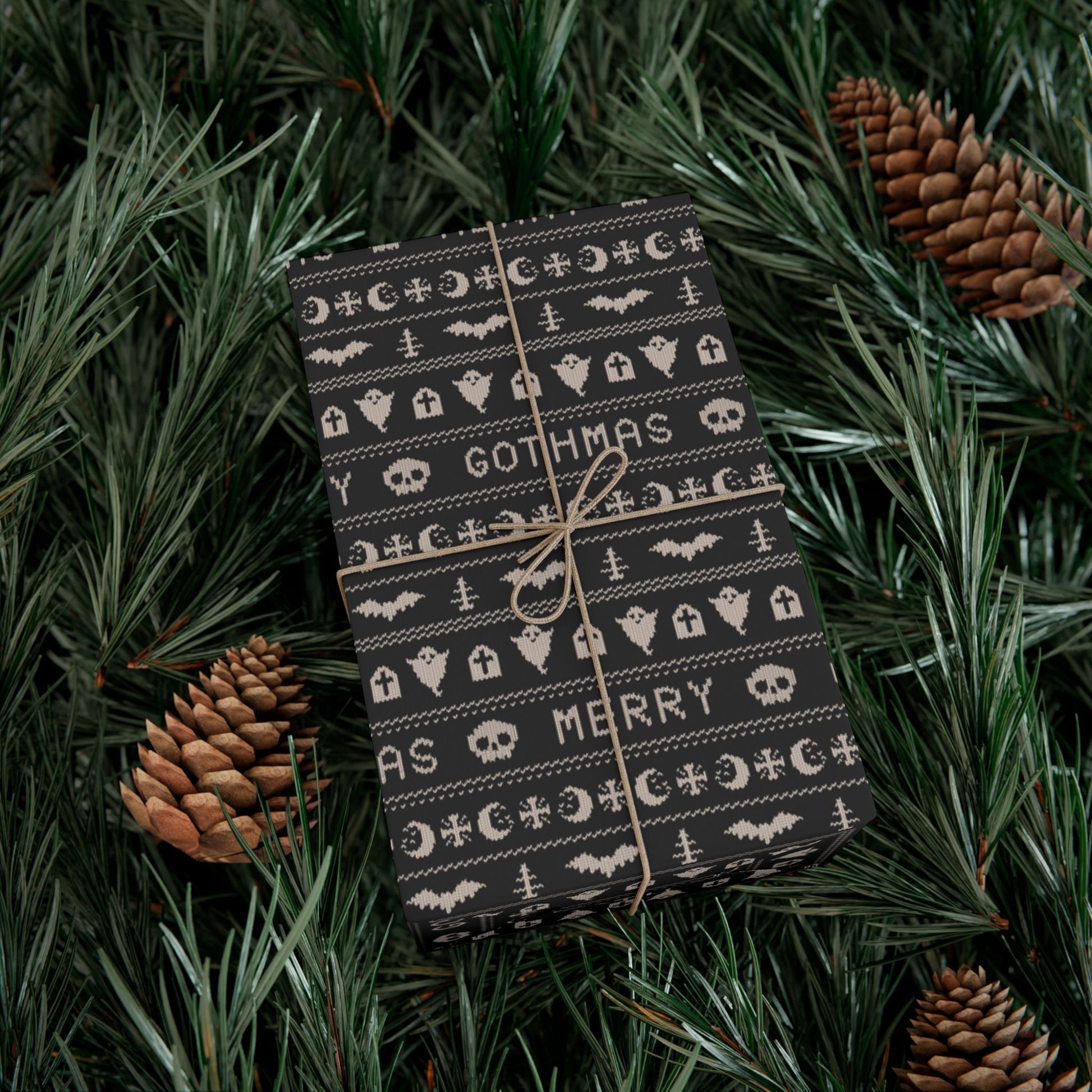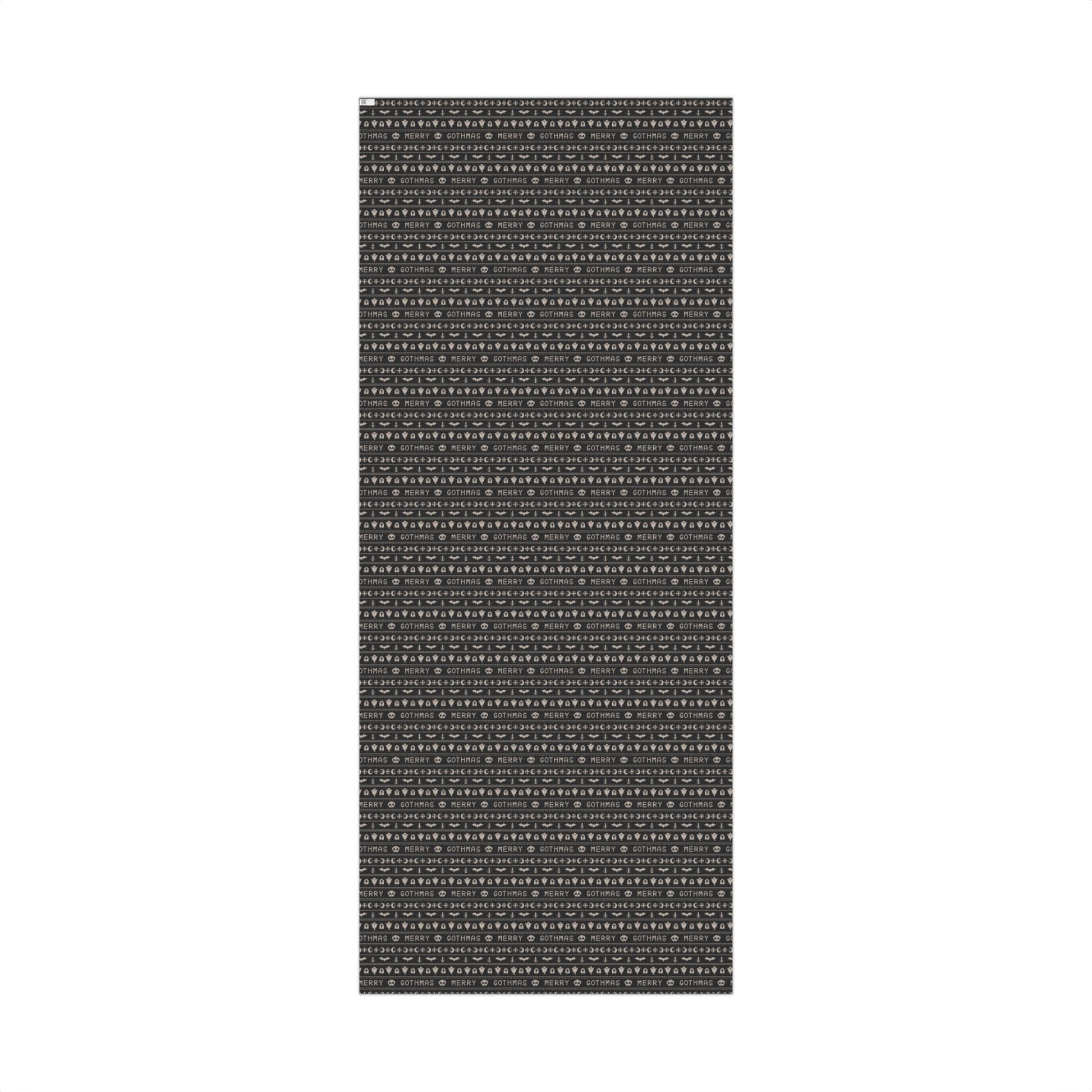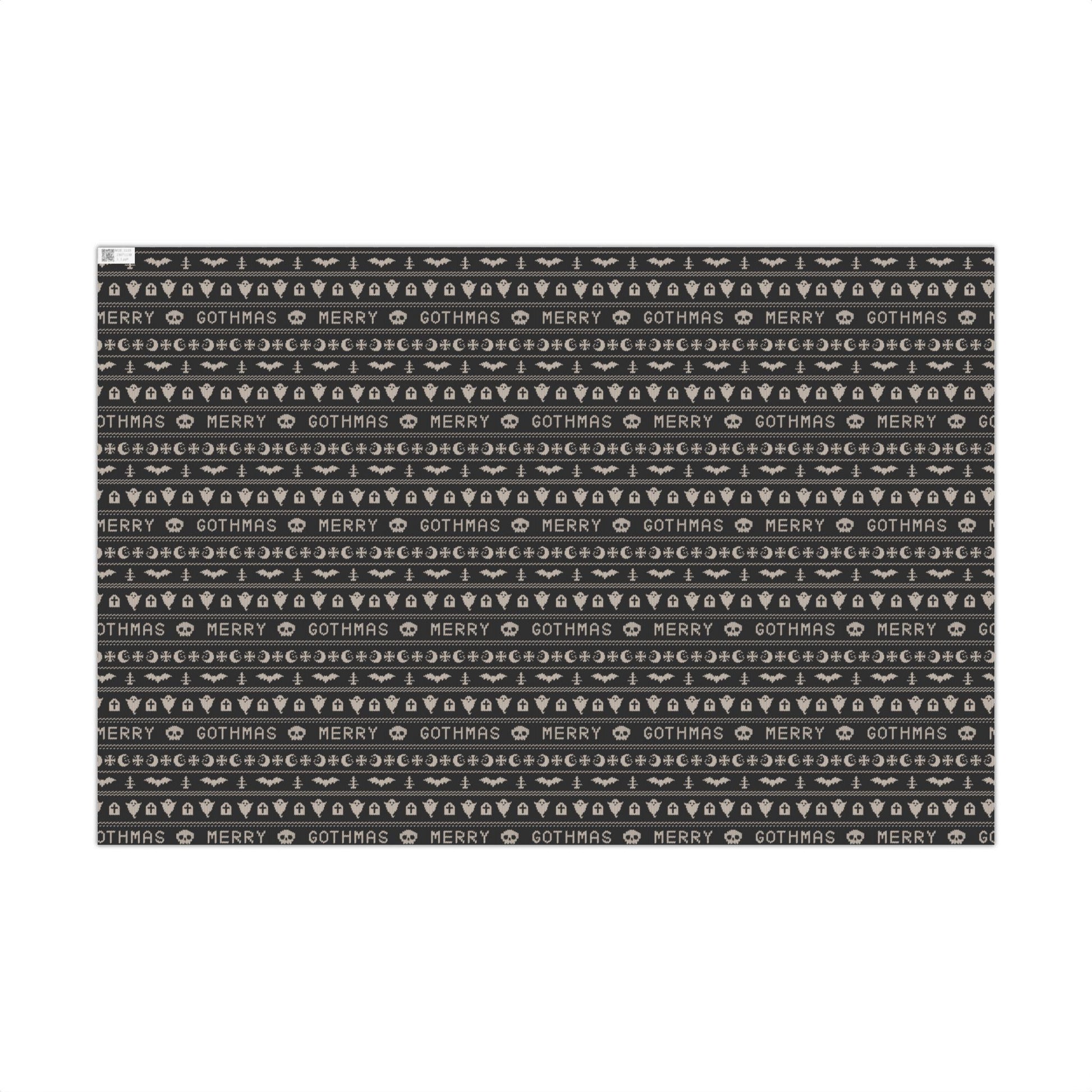Our goth Christmas & Creepmas ugly sweater inspired black gift wrap transforms the act of gift-giving into a whimsical and opulent spectacle. Picture your presents dressed up in chic black, saying "season’s creepings" with ghosts, bats and xmas trees in questionable faux-knit patterns!