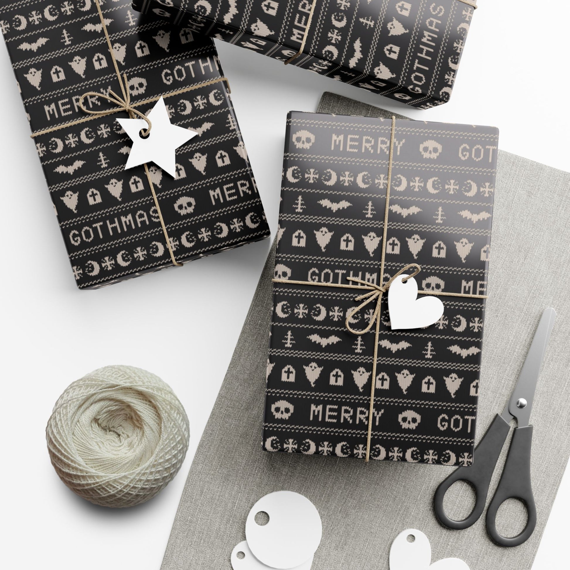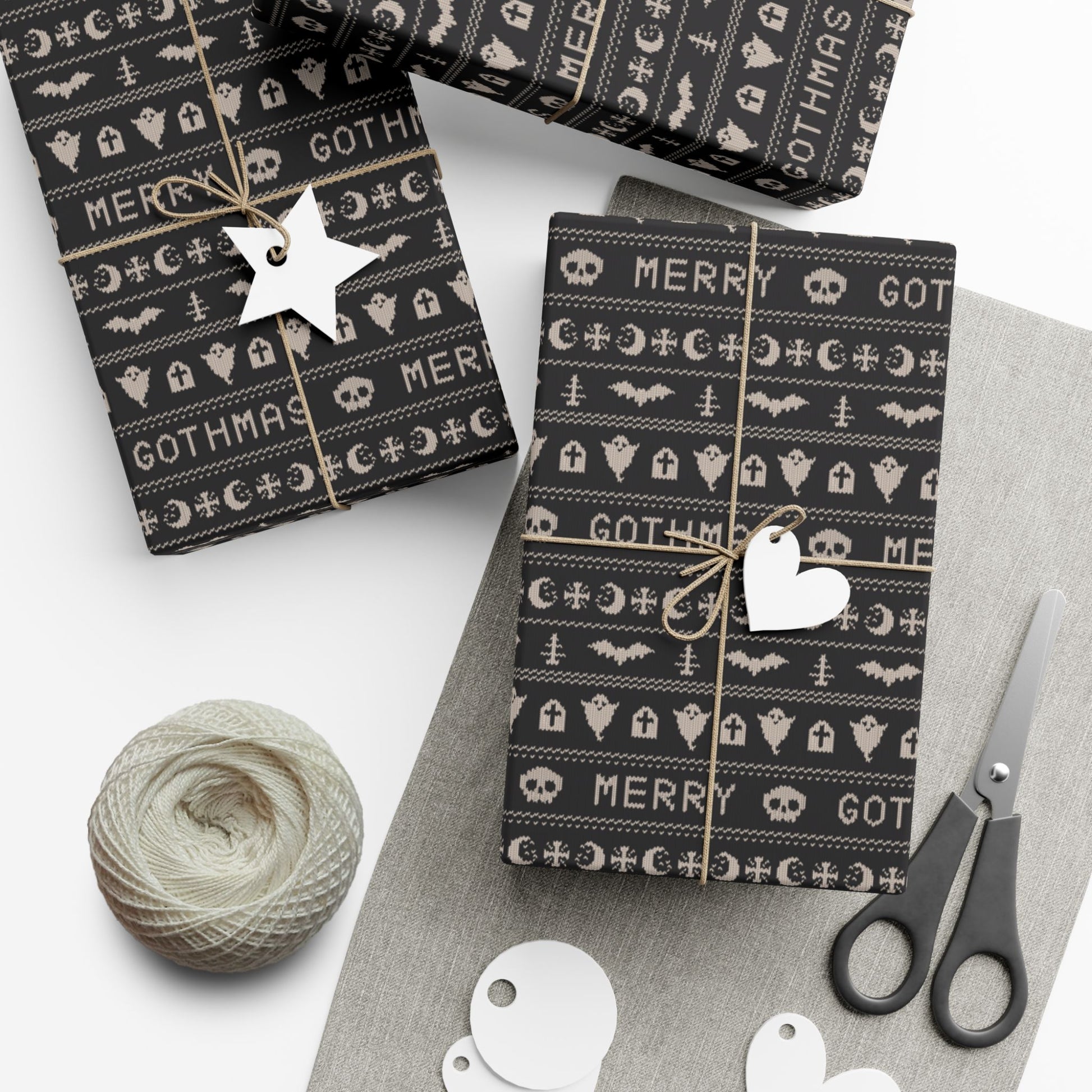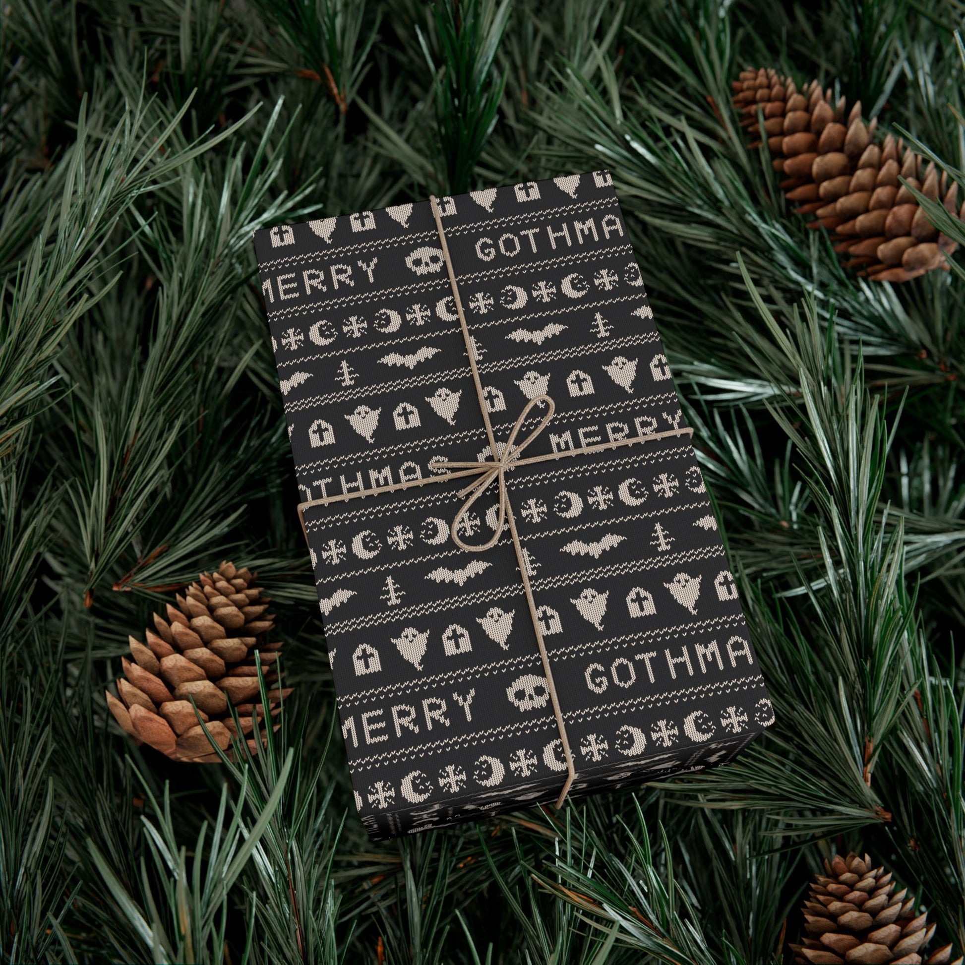 Our goth Christmas & Creepmas ugly sweater inspired black gift wrap transforms the act of gift-giving into a whimsical and opulent spectacle. Picture your presents dressed up in chic black, saying "season’s creepings" with ghosts, bats and xmas trees in questionable faux-knit patterns!