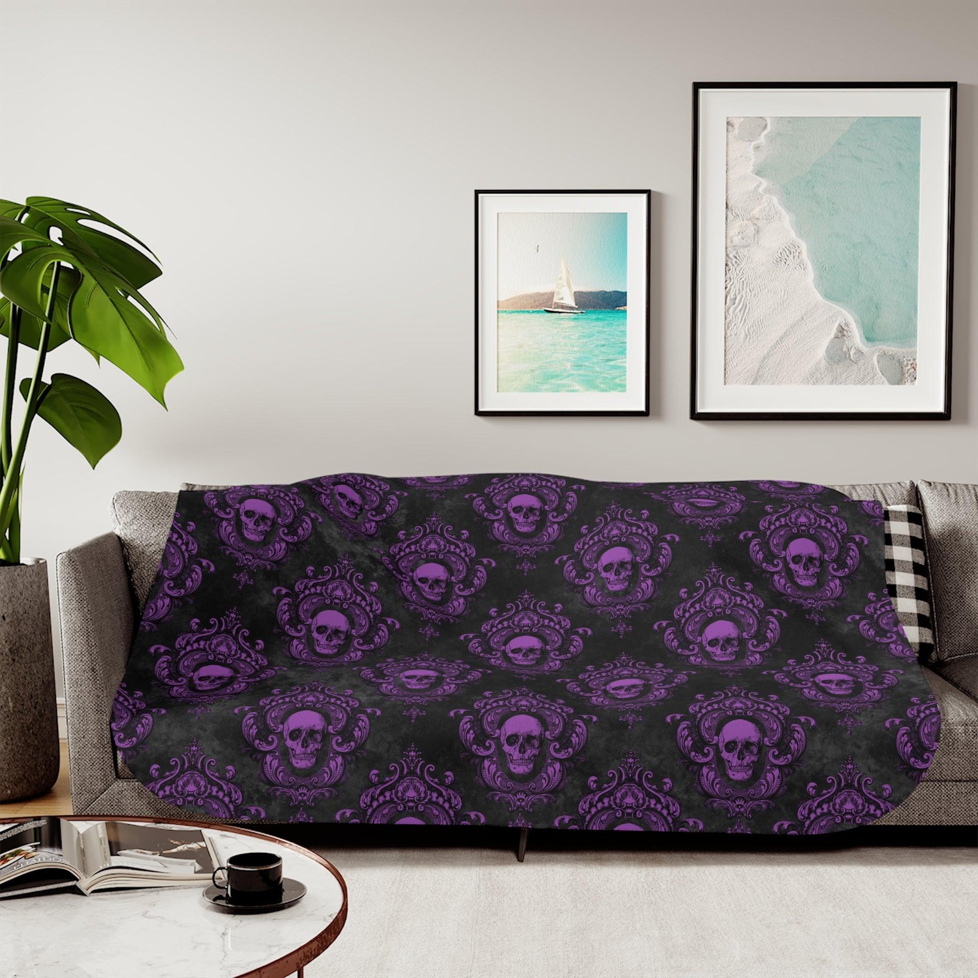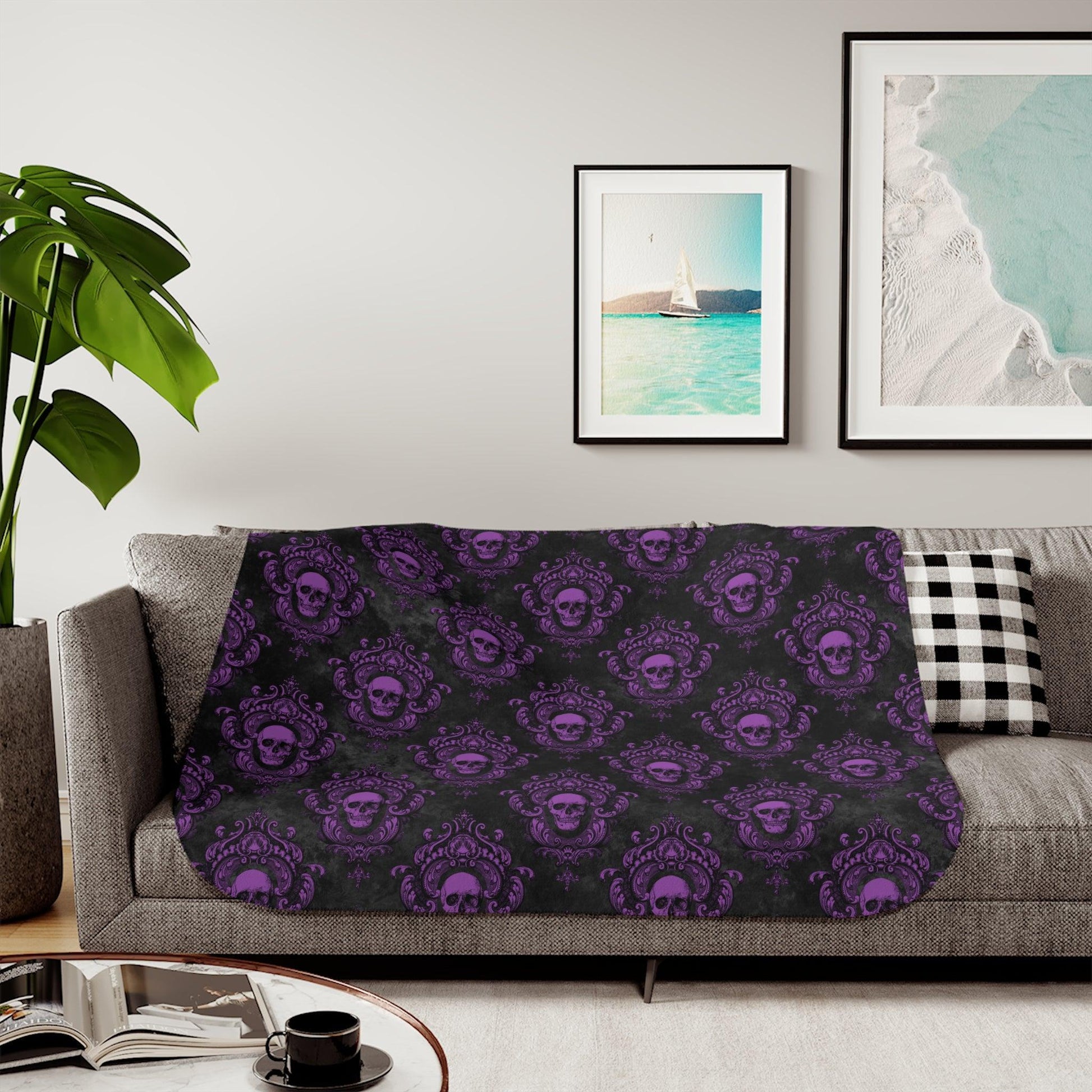 Add some dark academia, glam goth style to your home with our purple and black gothic skull design throw blanket, that reverses to a soft gray sherpa fleece. Perfect for snuggling with your favorite ghoul!
