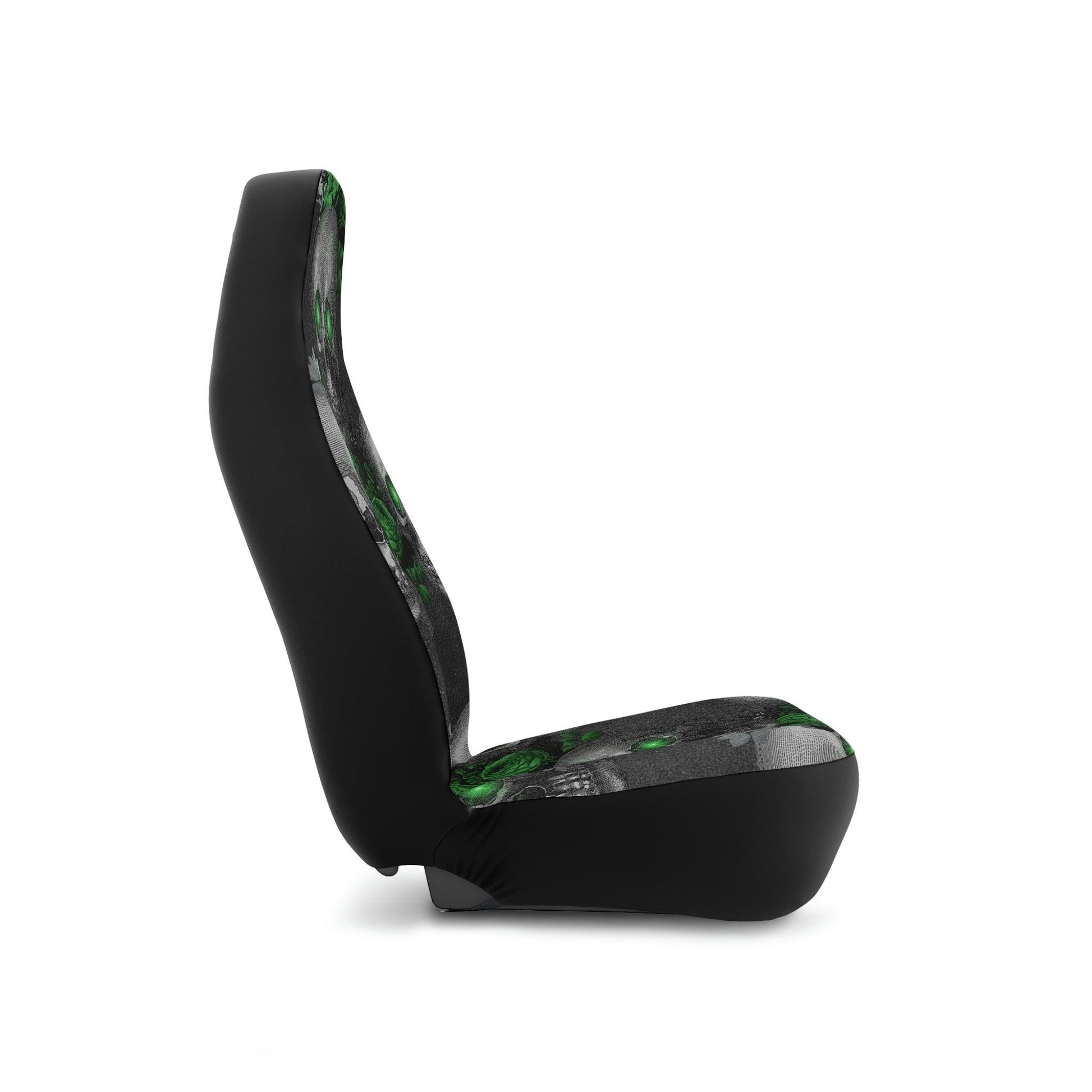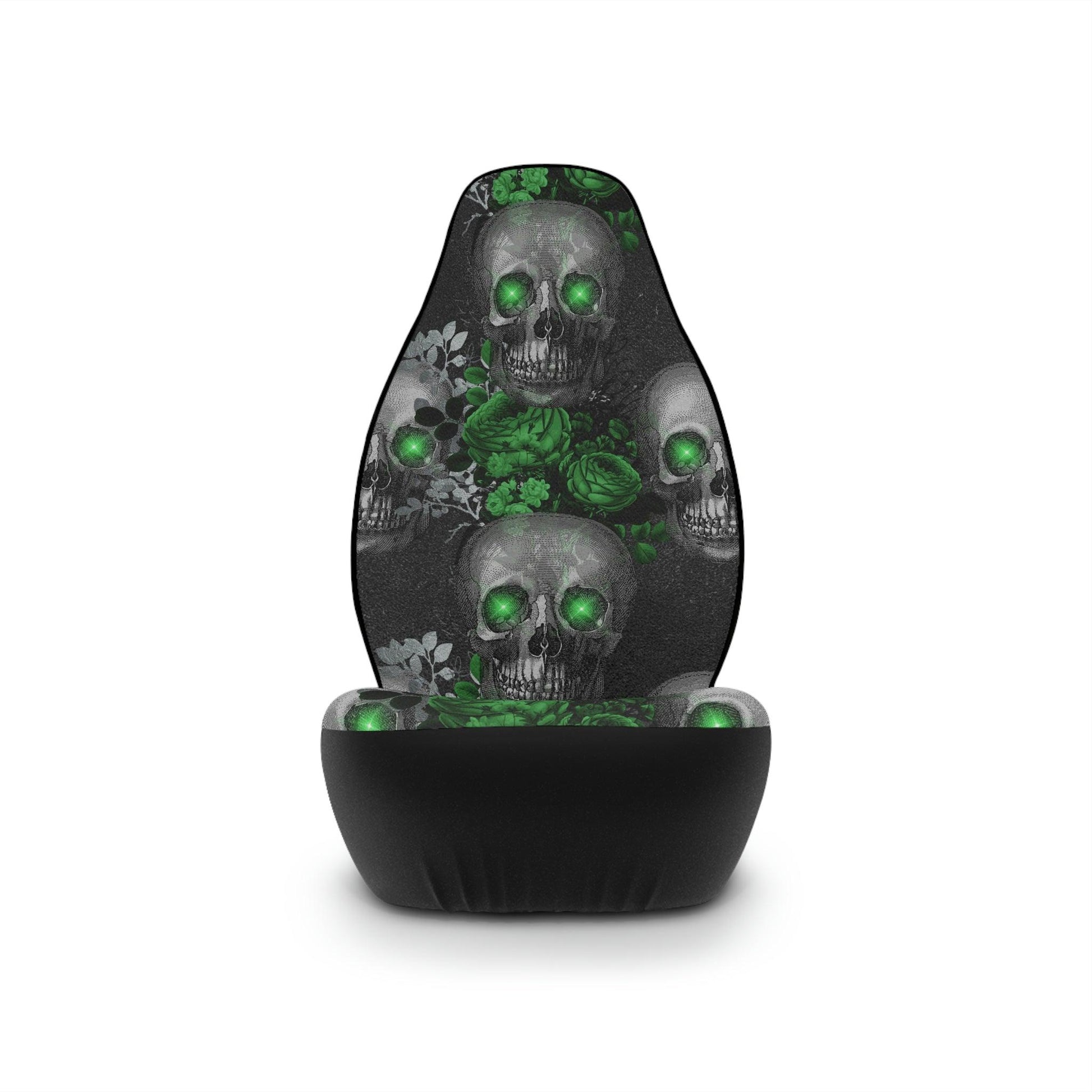 This car seat cover features gothic style skulls with eyes that give the illusion that they are glowing (*note that the eyes do NOT actually glow!) in a slick green and gray color combo!