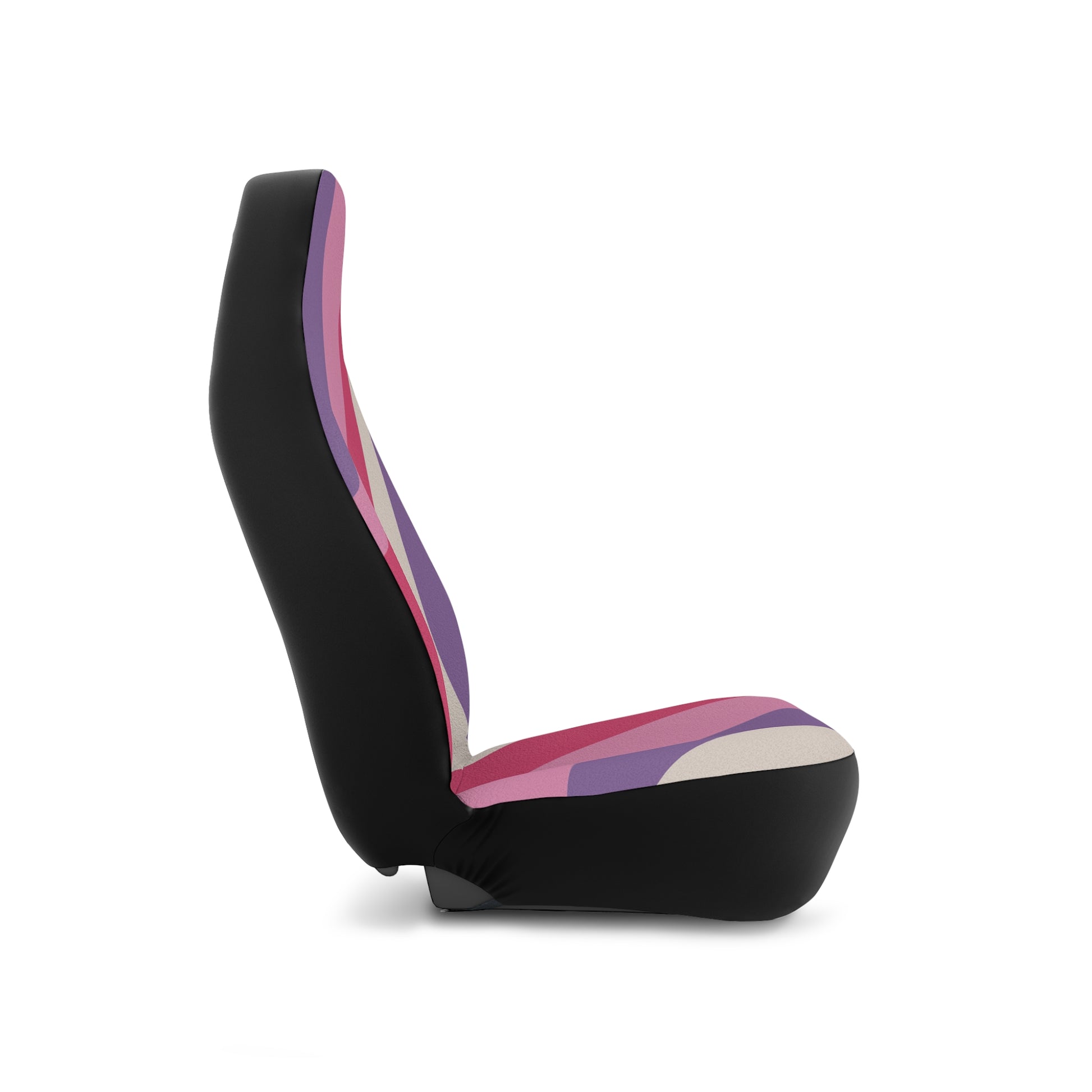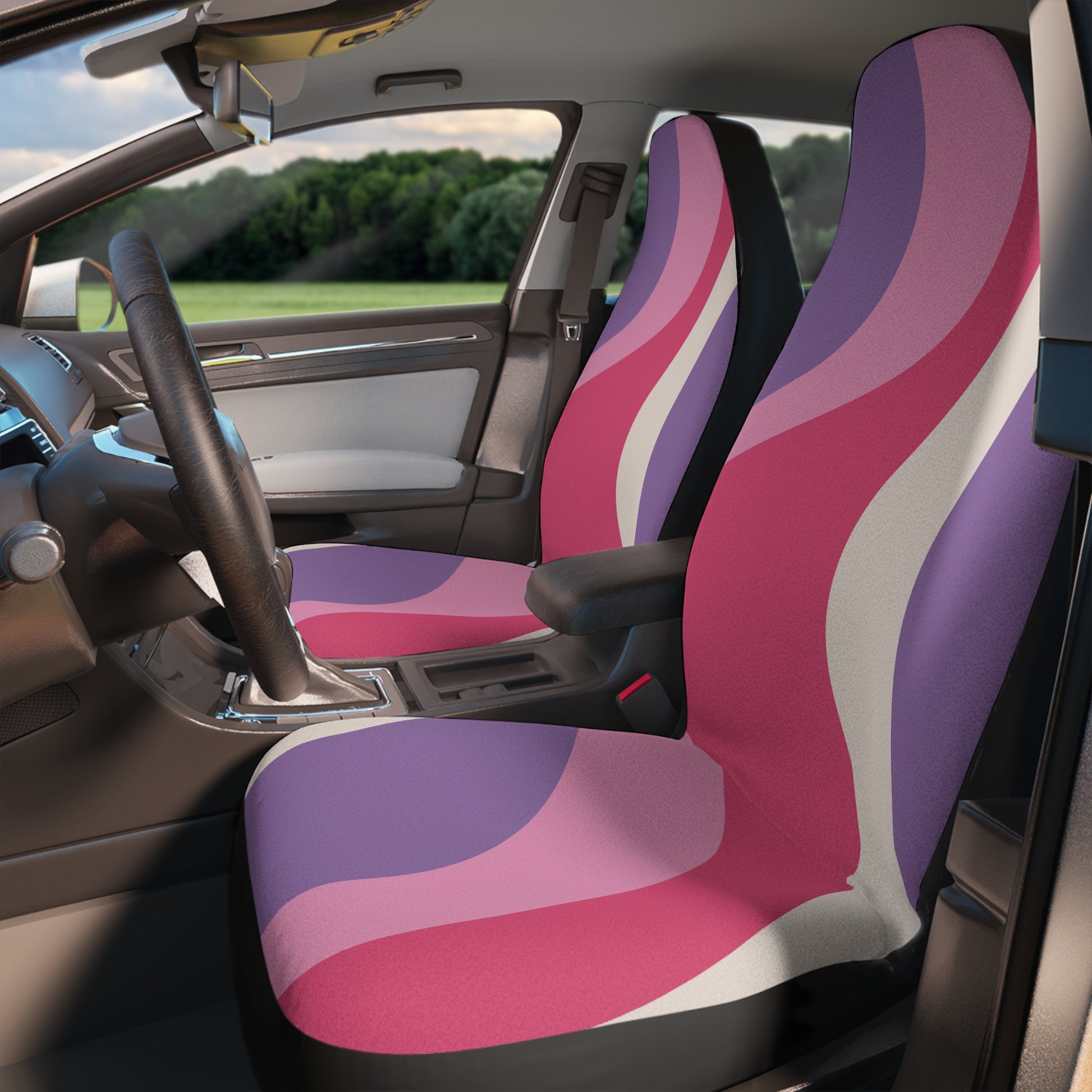 Customize your car's interior with our pink and purple, groovy 60's swirl car seat covers that reflect your colorful retro mod style! Made of thick, high quality polyester fabric for durability that lasts. Sold as a set of TWO. Important to note that these covers should NOT be used on seats with side airbags or armrests.