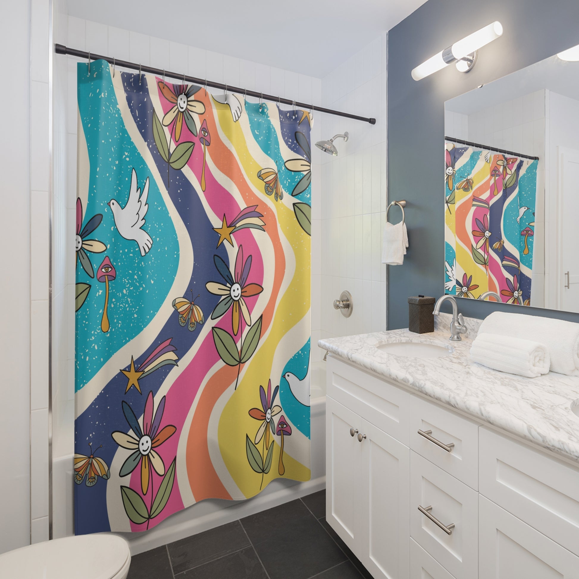 Groovy Hippie Flowers and Boho Mushrooms Multicolor Shower Curtain