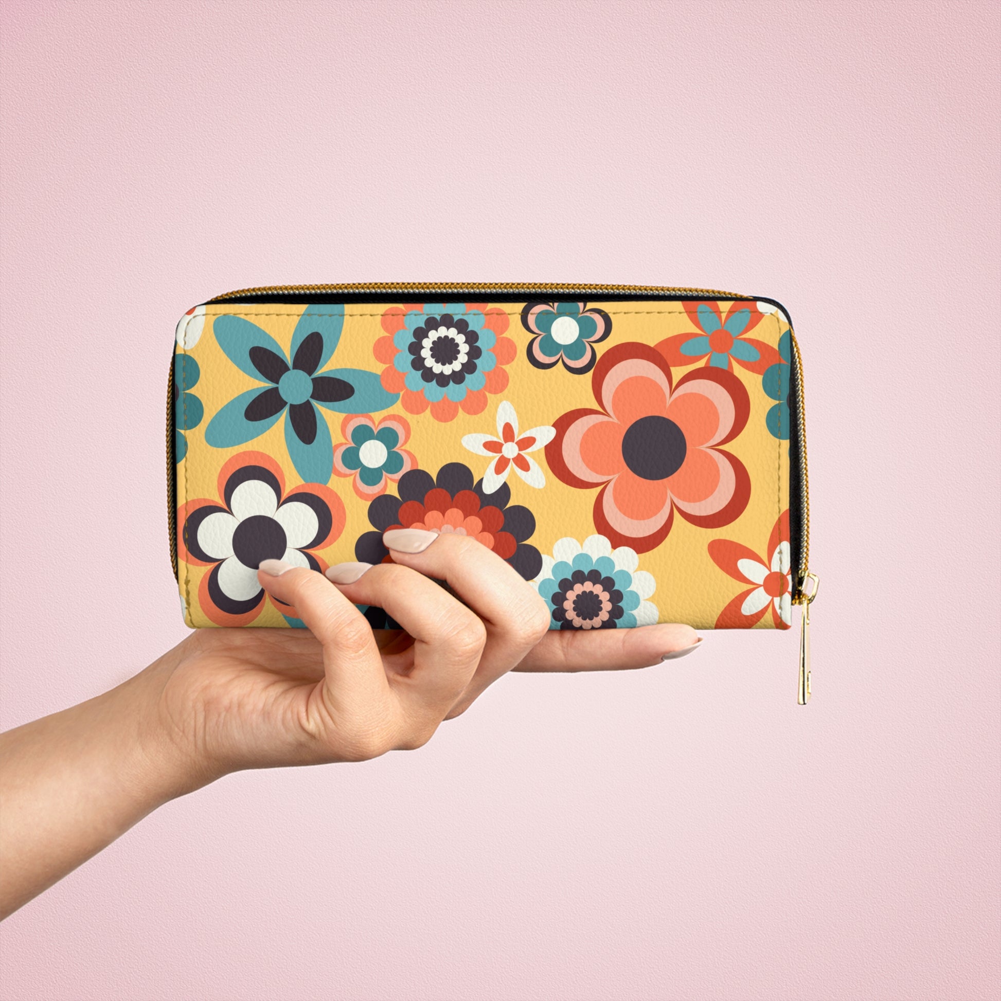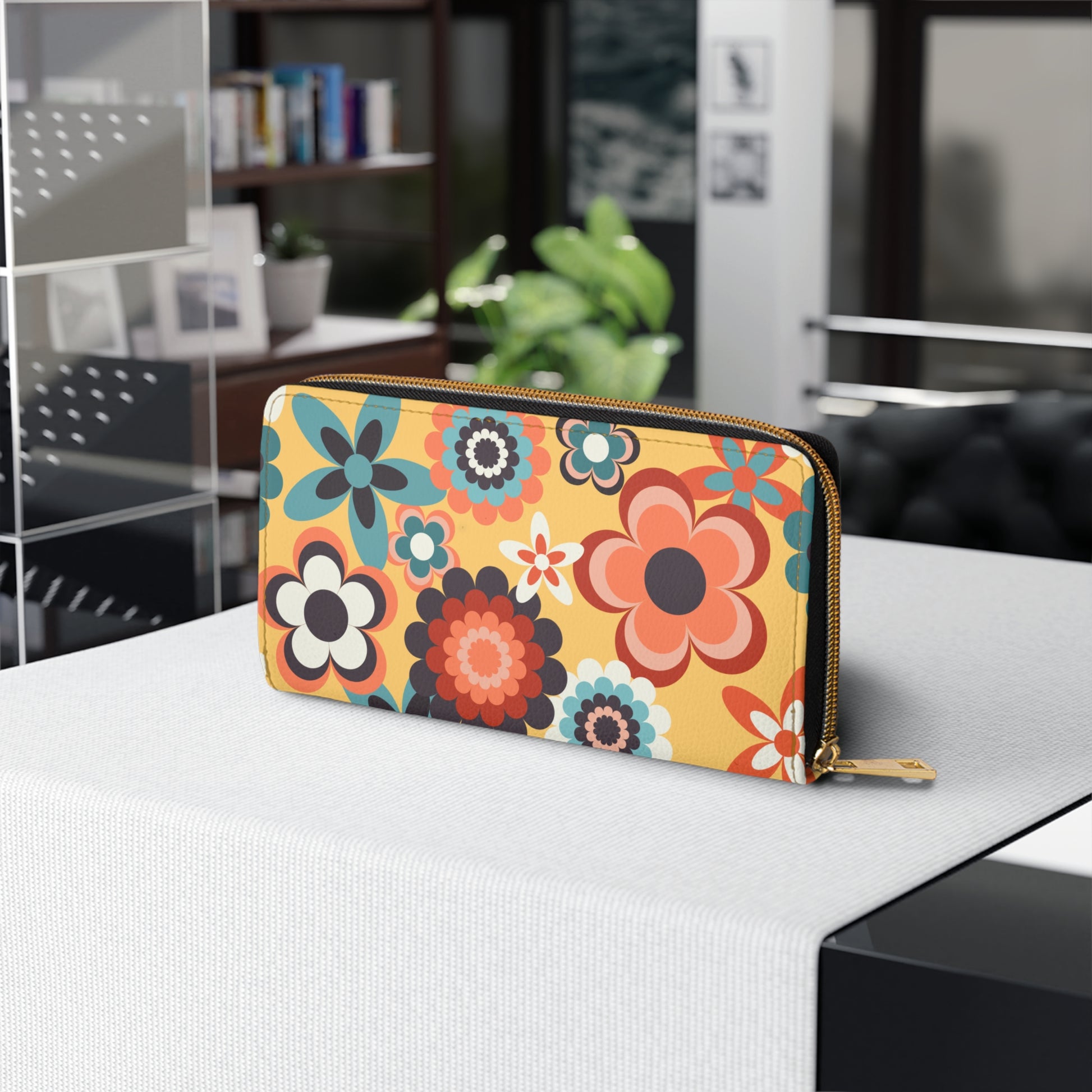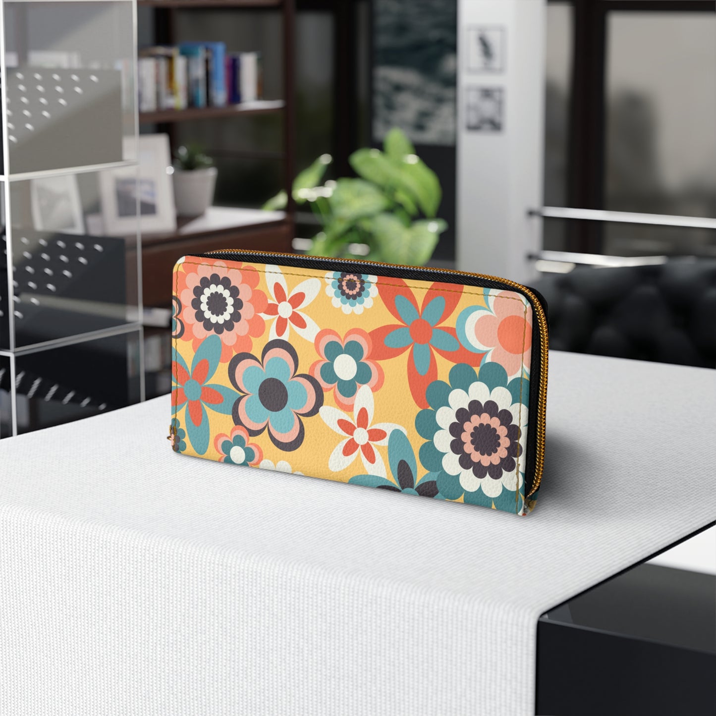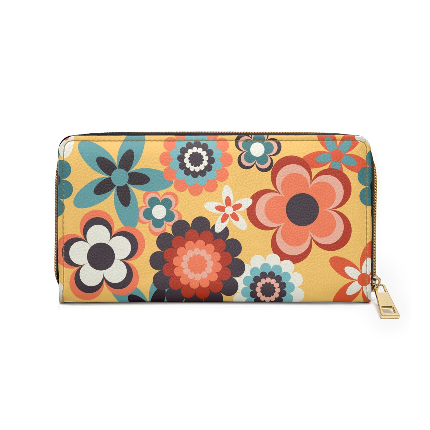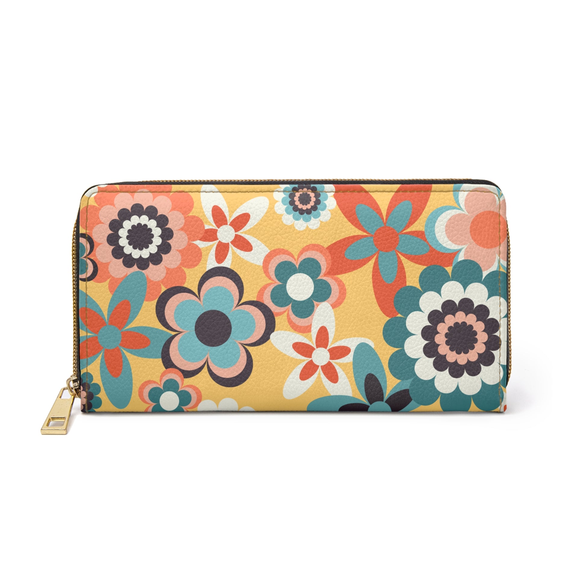 Groovy Retro 60s 70s Flowers Boho Mid Century Mod Yellow, Coral & Blue Zipper Wallet